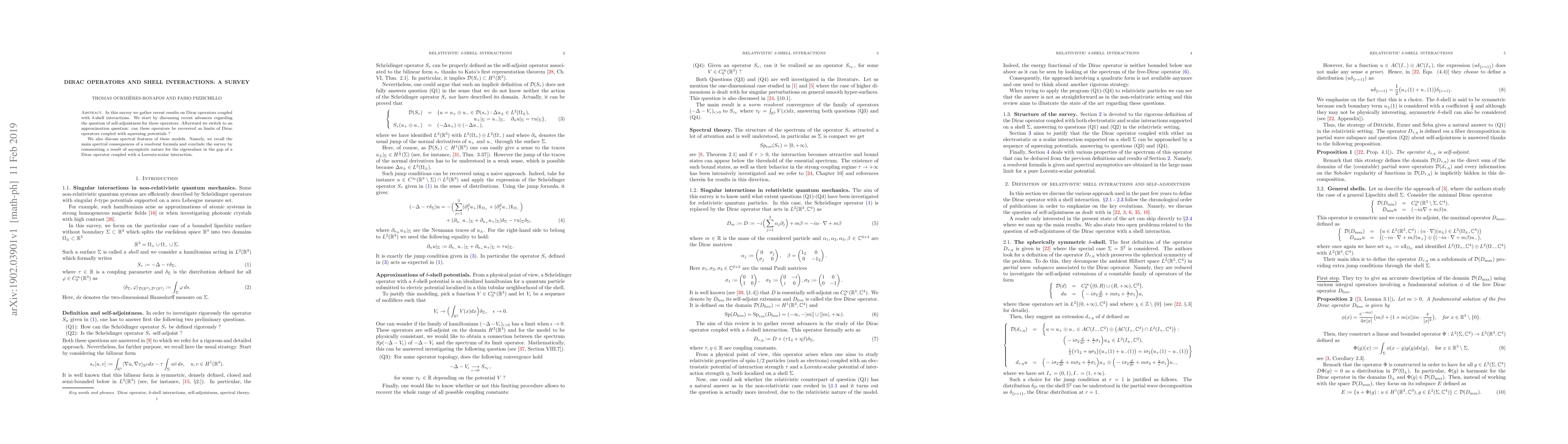 This survey reviews recent findings on Dirac operators with $\delta$-shell interactions, focusing on their self-adjointness, approximation via squeezing potentials, and spectral properties, concluding with asymptotic results for eigenvalues in the Dirac operator's gap with Lorentz-scalar interaction.