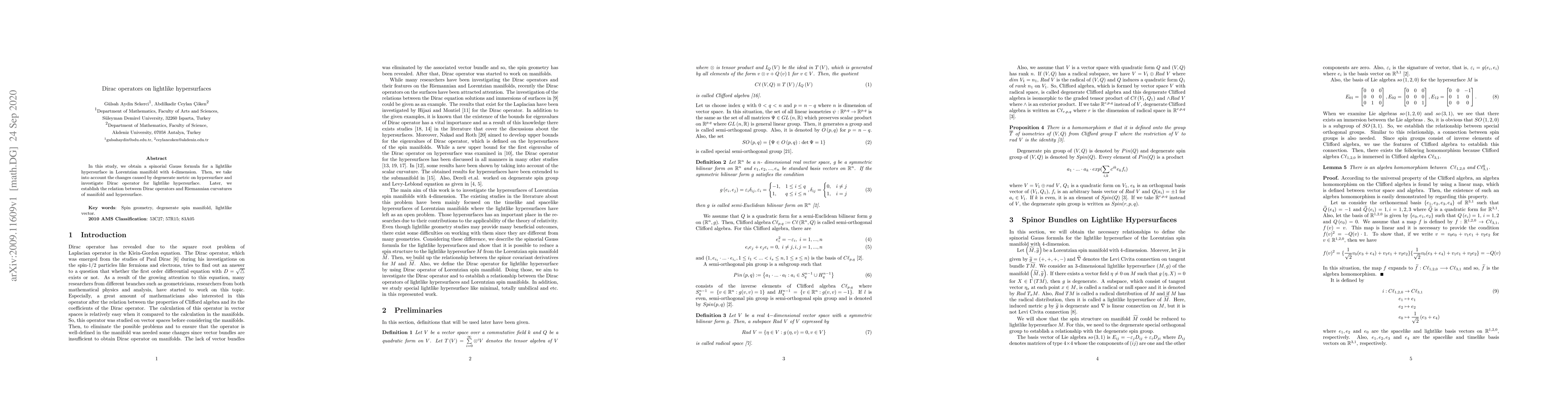 In this study, we obtain a spinorial Gauss formula for a lightlike hypersurface in Lorentzian manifold with 4-dimension. Then, we take into account the changes caused by degenerate metric on hypersurface and investigate Dirac operator for lightlike hypersurface. Later, we establish the relation between Dirac operators and Riemannian curvatures of manifold and hypersurface.