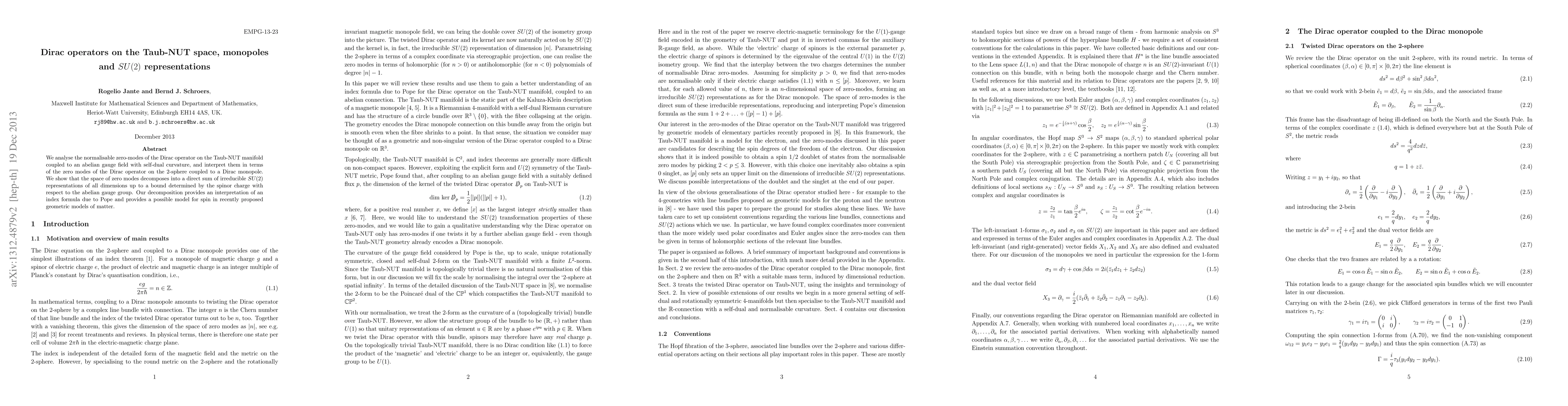 We analyse the normalisable zero-modes of the Dirac operator on the Taub-NUT manifold coupled to an abelian gauge field with self-dual curvature, and interpret them in terms of the zero modes of the Dirac operator on the 2-sphere coupled to a Dirac monopole. We show that the space of zero modes decomposes into a direct sum of irreducible SU(2) representations of all dimensions up to a bound determined by the spinor charge with respect to the abelian gauge group. Our decomposition provides an interpretation of an index formula due to Pope and provides a possible model for spin in recently proposed geometric models of matter.