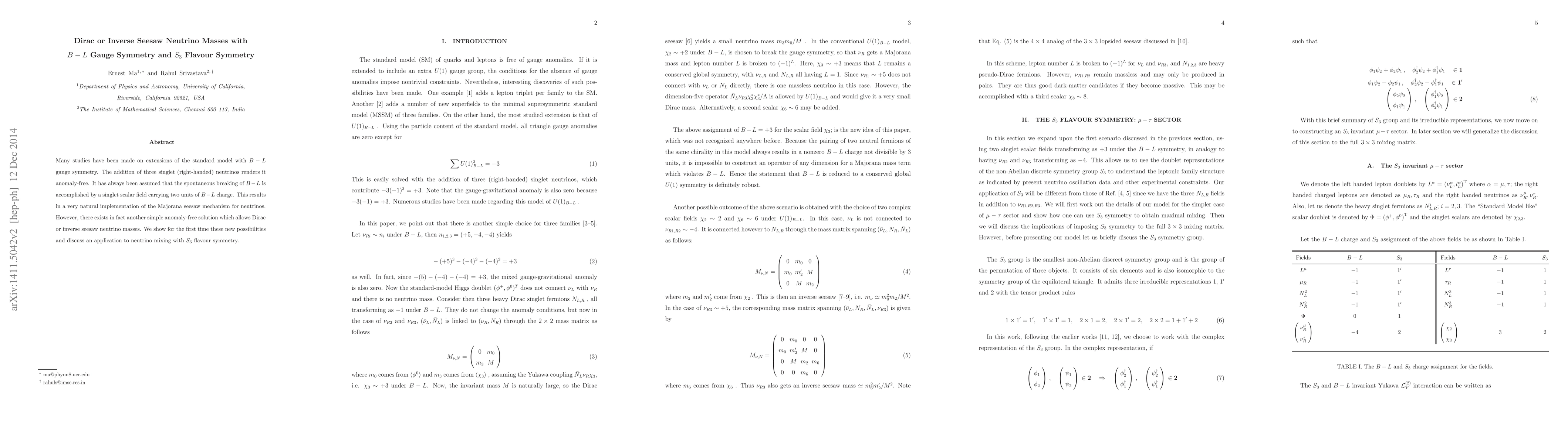 The paper explores extensions of the Standard Model with $B-L$ gauge symmetry, focusing on anomaly-free solutions that allow for Dirac or inverse seesaw neutrino masses. It utilizes $S_3$ flavour symmetry to discuss an application to neutrino mixing.