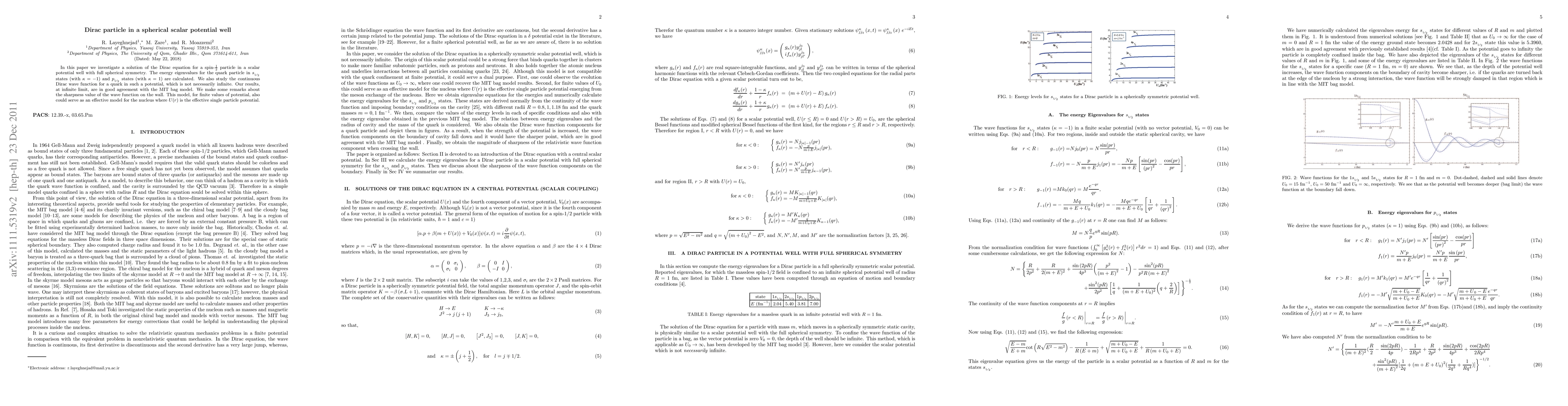 This paper examines the Dirac equation for a spin-$\frac{1}{2}$ particle in a spherical scalar potential well, calculating energy eigenvalues for $s_{1/2}$ and $p_{1/2}$ states and analyzing the continuous wave function. Results align well with the MIT bag model at infinite limits, suggesting the model's potential application to nuclear physics.