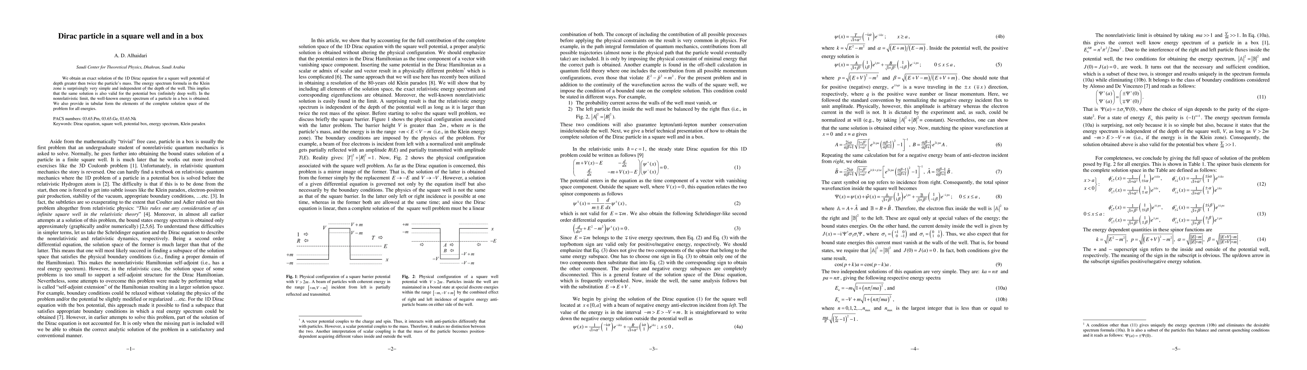 This paper presents an exact solution of the 1D Dirac equation for a square well potential, revealing a simple energy spectrum independent of well depth. The same solution applies to an infinitely deep box, yielding the nonrelativistic particle-in-a-box spectrum, and includes a complete solution space table.