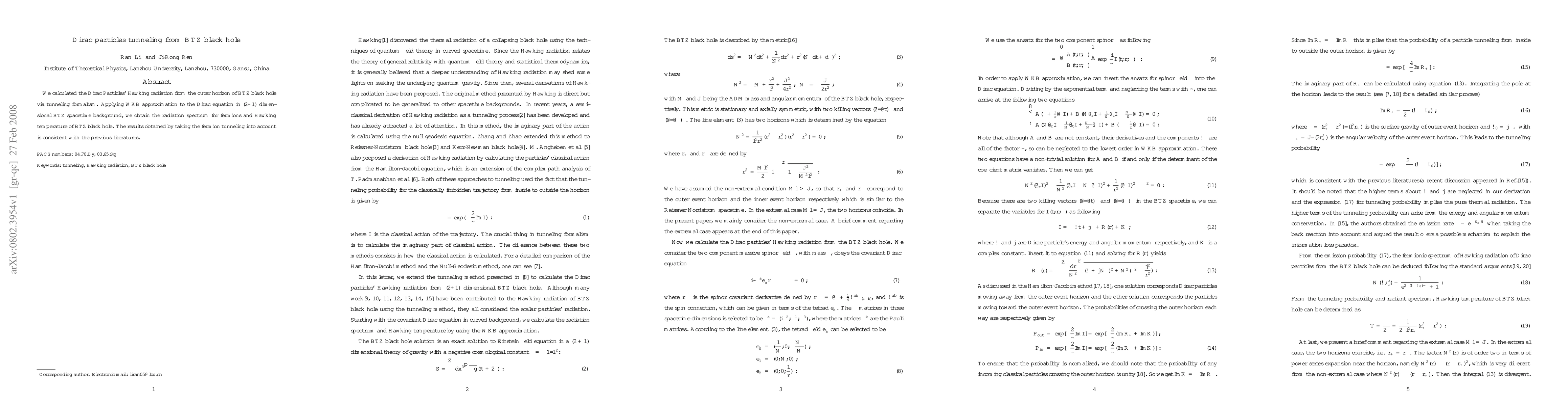 This research calculates the Hawking radiation for Dirac particles tunneling from a BTZ black hole using the WKB approximation in a (2+1) dimensional spacetime, yielding a consistent fermion radiation spectrum and Hawking temperature as reported in previous studies.