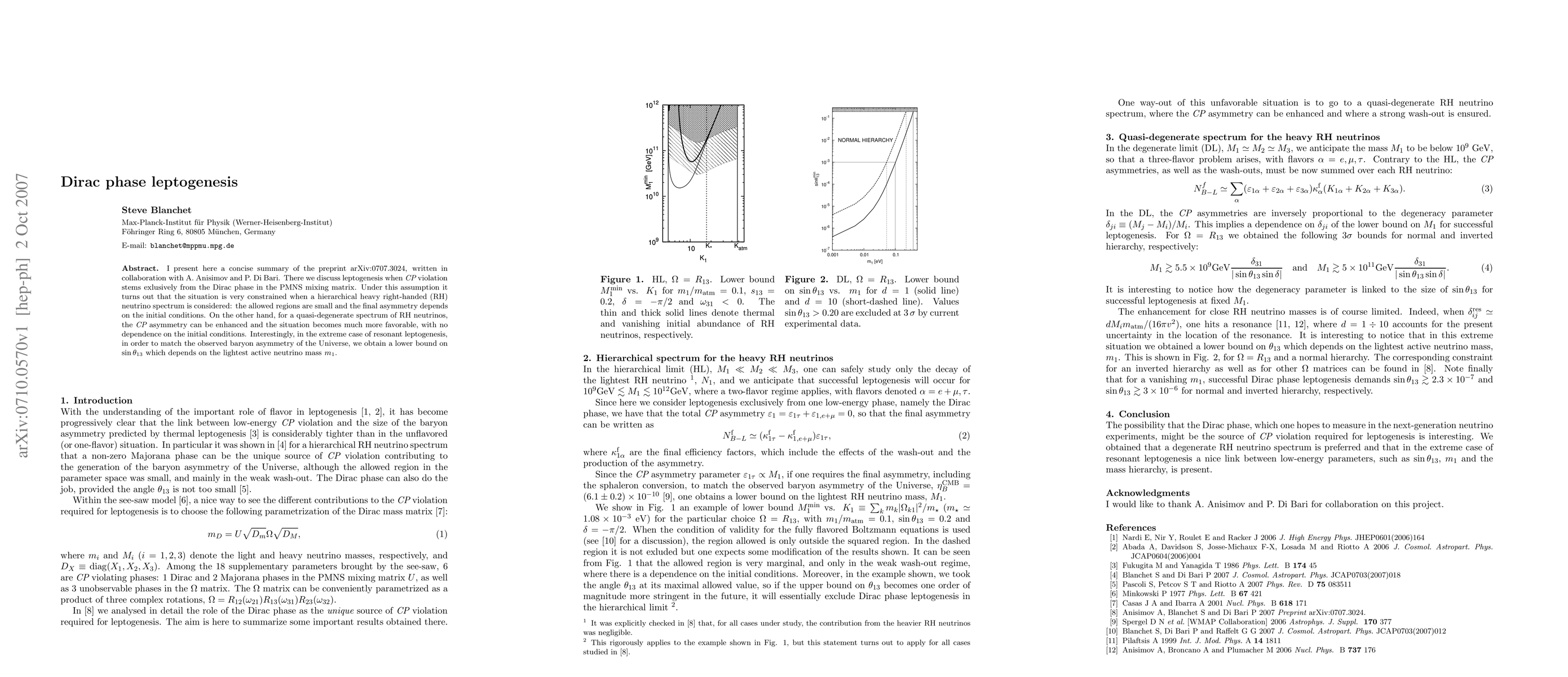 I present here a concise summary of the preprint arXiv:0707.3024, written in collaboration with A. Anisimov and P. Di Bari. There we discuss leptogenesis when {\em CP} violation stems exlusively from the Dirac phase in the PMNS mixing matrix. Under this assumption it turns out that the situation is very constrained when a hierarchical heavy right-handed (RH) neutrino spectrum is considered: the allowed regions are small and the final asymmetry depends on the initial conditions. On the other hand, for a quasi-degenerate spectrum of RH neutrinos, the {\em CP} asymmetry can be enhanced and the situation becomes much more favorable, with no dependence on the initial conditions. Interestingly, in the extreme case of resonant leptogenesis, in order to match the observed baryon asymmetry of the Universe, we obtain a lower bound on \sin \q_{13} which depends on the lightest active neutrino mass m_1.