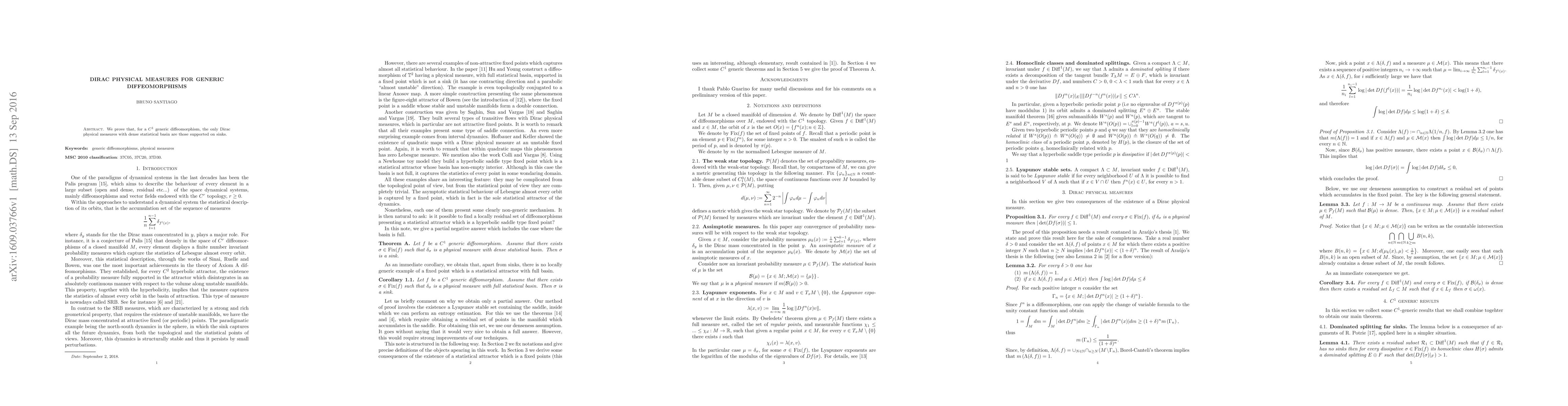 Summary: This paper demonstrates that for $C^1$ generic diffeomorphisms, the only Dirac physical measures with dense statistical basins are those associated with sinks. This result highlights the behavior of dynamical systems in the presence of sinks.
