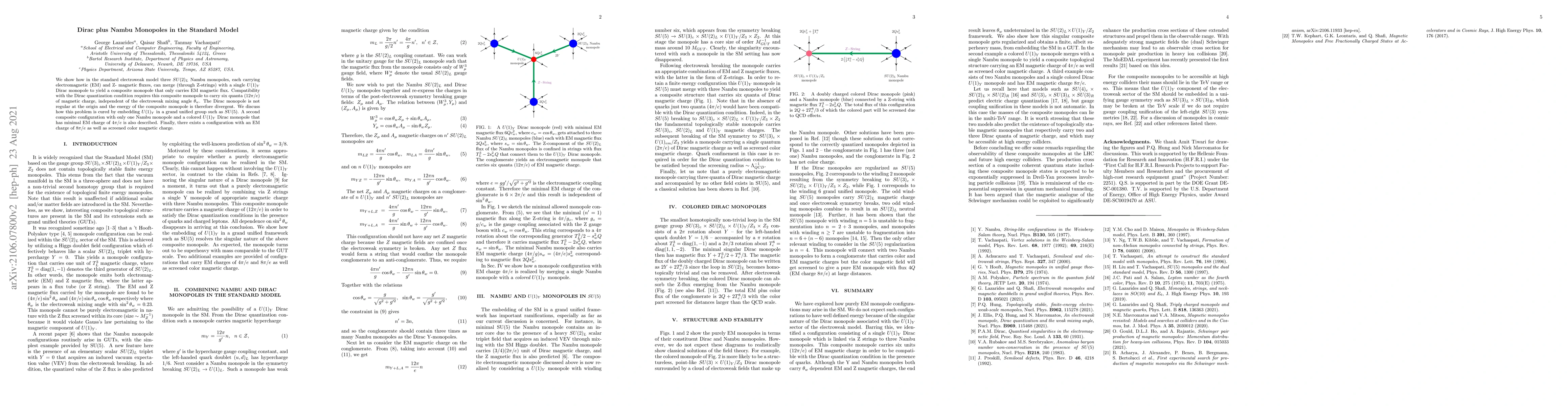 We show how in the standard electroweak model three $SU(2)_L$ Nambu monopoles, each carrying electromagnetic (EM) and Z- magnetic fluxes, can merge (through Z-strings) with a single $U(1)_Y$ Dirac monopole to yield a composite monopole that only carries EM magnetic flux. Compatibility with the Dirac quantization condition requires this composite monopole to carry six quanta ($12 \pi /e$) of magnetic charge, independent of the electroweak mixing angle $\theta_w$. The Dirac monopole is not regular at the origin and the energy of the composite monopole is therefore divergent. We discuss how this problem is cured by embedding $U(1)_Y$ in a grand unified group such as $SU(5)$. A second composite configuration with only one Nambu monopole and a colored $U(1)_Y$ Dirac monopole that has minimal EM charge of $4\pi/e$ is also described. Finally, there exists a configuration with an EM charge of $8\pi/e$ as well as screened color magnetic charge.