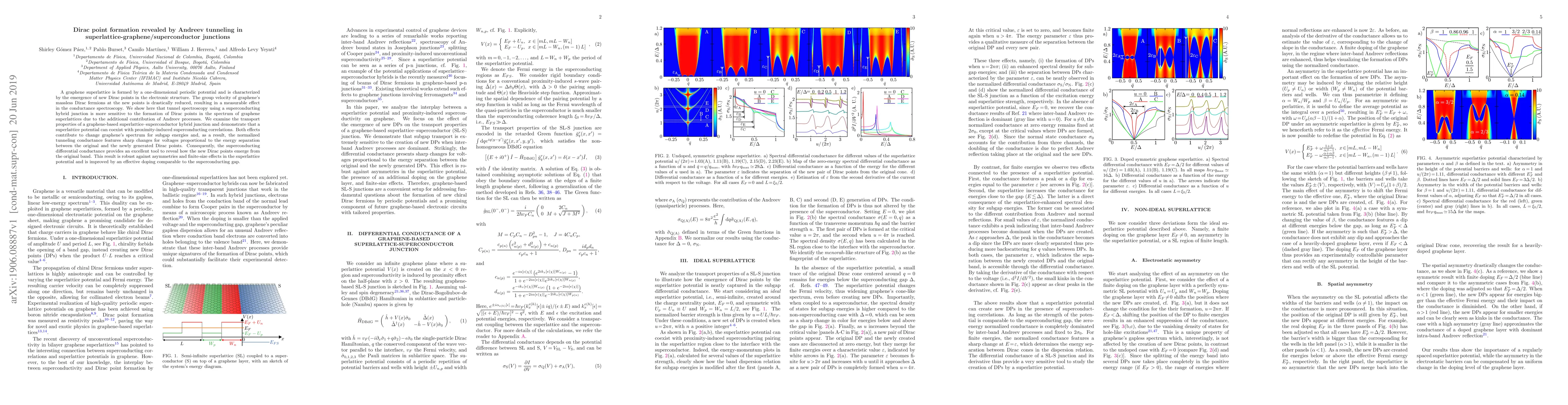 A graphene superlattice is formed by a one-dimensional periodic potential and is characterized by the emergence of new Dirac points in the electronic structure. The group velocity of graphene's massless Dirac fermions at the new points is drastically reduced, resulting in a measurable effect in the conductance spectroscopy. We show here that tunnel spectroscopy using a superconducting hybrid junction is more sensitive to the formation of Dirac points in the spectrum of graphene superlattices due to the additional contribution of Andreev processes. We examine the transport properties of a graphene-based superlattice--superconductor hybrid junction and demonstrate that a superlattice potential can coexist with proximity-induced superconducting correlations. Both effects contribute to change graphene's spectrum for subgap energies and, as a result, the normalized tunneling conductance features sharp changes for voltages proportional to the energy separation between the original and the newly generated Dirac points.