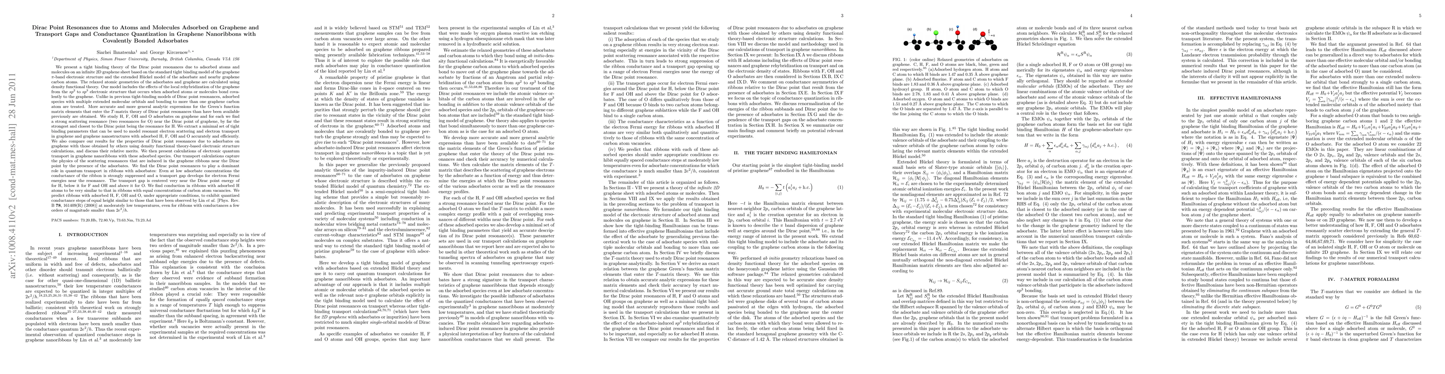 This paper develops a tight binding theory to analyze Dirac point resonances caused by atoms and molecules adsorbed on graphene, including the effects of local rehybridization. It identifies strong scattering resonances near the Dirac point for H, F, OH, and O adsorbates, providing a minimal set of tight binding parameters for modeling electron transport in graphene nanostructures with these adsorbates.