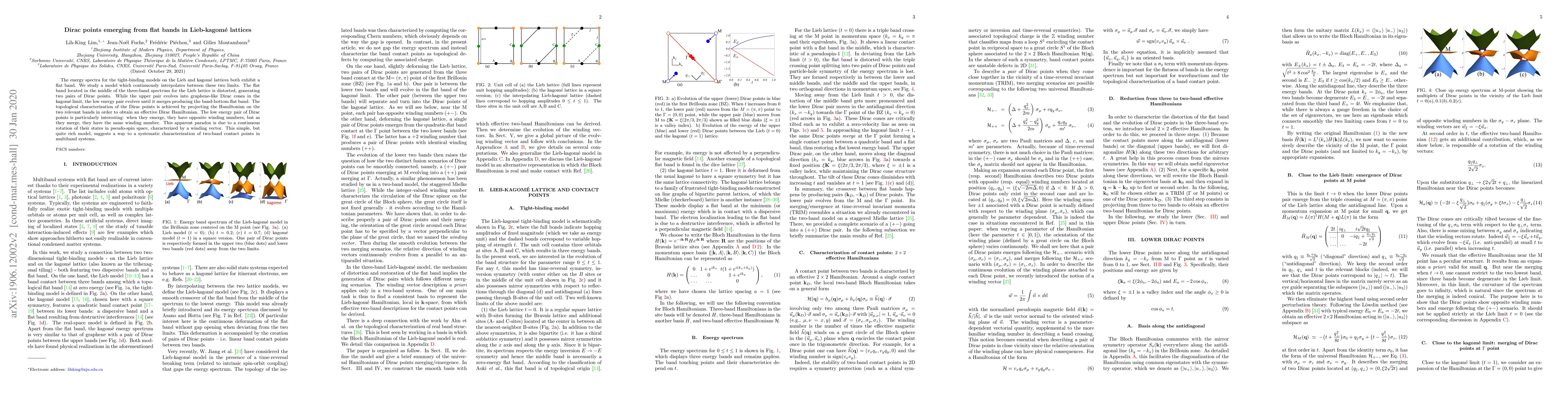 The energy spectra for the tight-binding models on the Lieb and kagom\'e lattices both exhibit a flat band. We present a model which continuously interpolates between these two limits. The flat band located in the middle of the three-band spectrum for the Lieb lattice is distorted, generating two pairs of Dirac points. While the upper pair evolves into graphene-like Dirac cones in the kagom\'e limit, the low energy pair evolves until it merges producing the band-bottom flat band. The topological characterization of the Dirac points is achieved by projecting the Hamiltonian on the two relevant bands in order to obtain an effective Dirac Hamiltonian. The low energy pair of Dirac points is particularly interesting in this respect: when they emerge, they have opposite winding numbers, but as they merge, they have the same winding number. This apparent paradox is due to a continuous rotation of their states in pseudo-spin space, characterized by a winding vector. This simple, but quite rich model, suggests a way to a systematic characterization of two-band contact points in multiband systems.