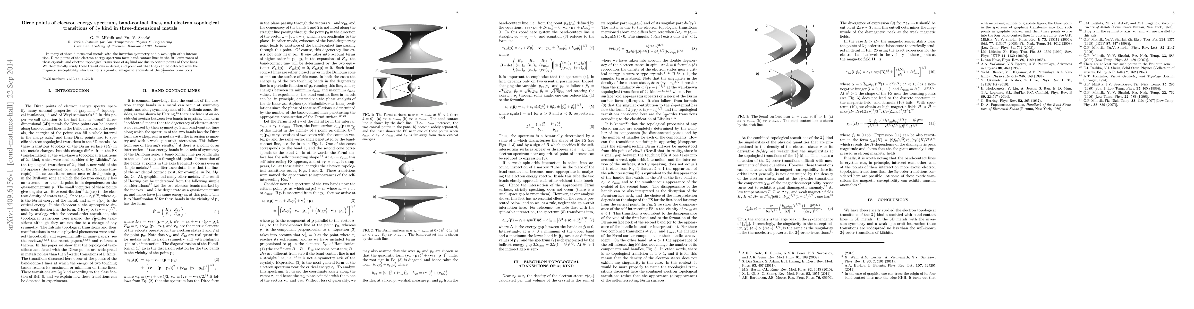 In many of three-dimensional metals with the inversion symmetry and a weak spin-orbit interaction, Dirac points of the electron energy spectrum form band-contact lines in the Brillouin zones of these crystals, and electron topological transitions of 3 1/2 kind are due to certain points of these lines. We theoretically study these transitions in detail, and point out that they can be detected with the magnetic susceptibility which exhibits a giant diamagnetic anomaly at the 3 1/2 -order transitions.