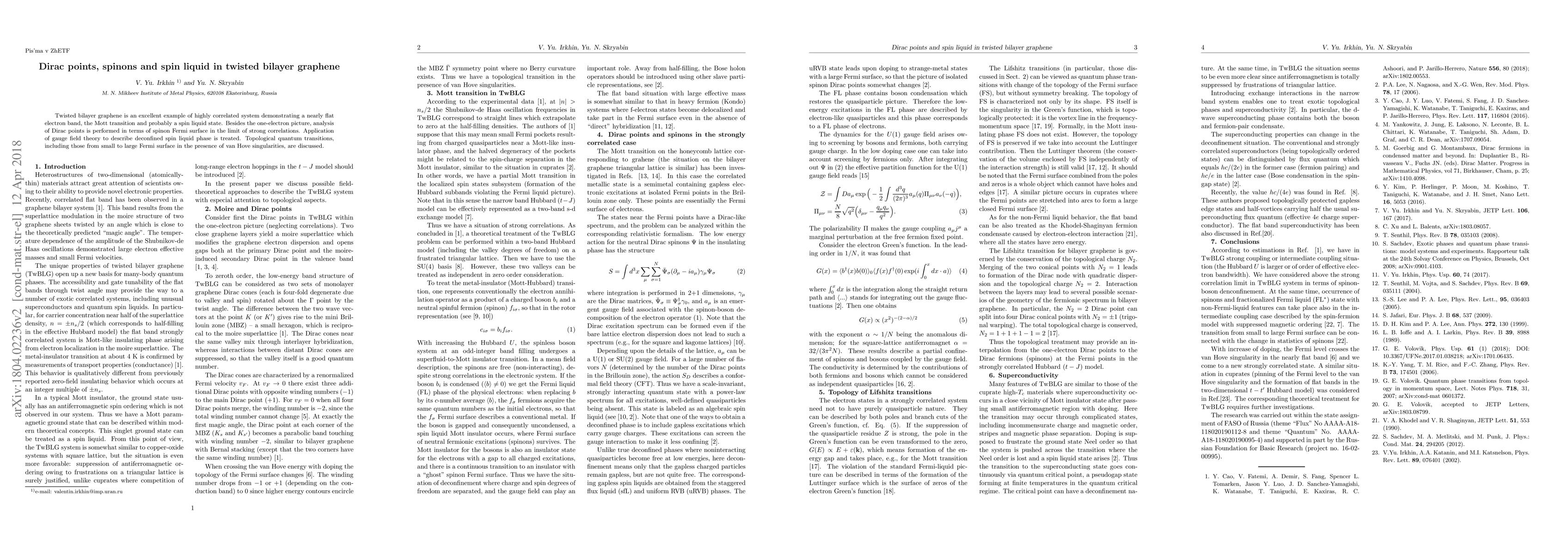 This paper investigates the highly correlated system of twisted bilayer graphene, focusing on the emergence of Dirac points, spinons, and a potential spin liquid state. It employs gauge field theory to describe the deconfined spin liquid phase and explores topological quantum transitions, particularly those involving changes in the Fermi surface near van Hove singularities.