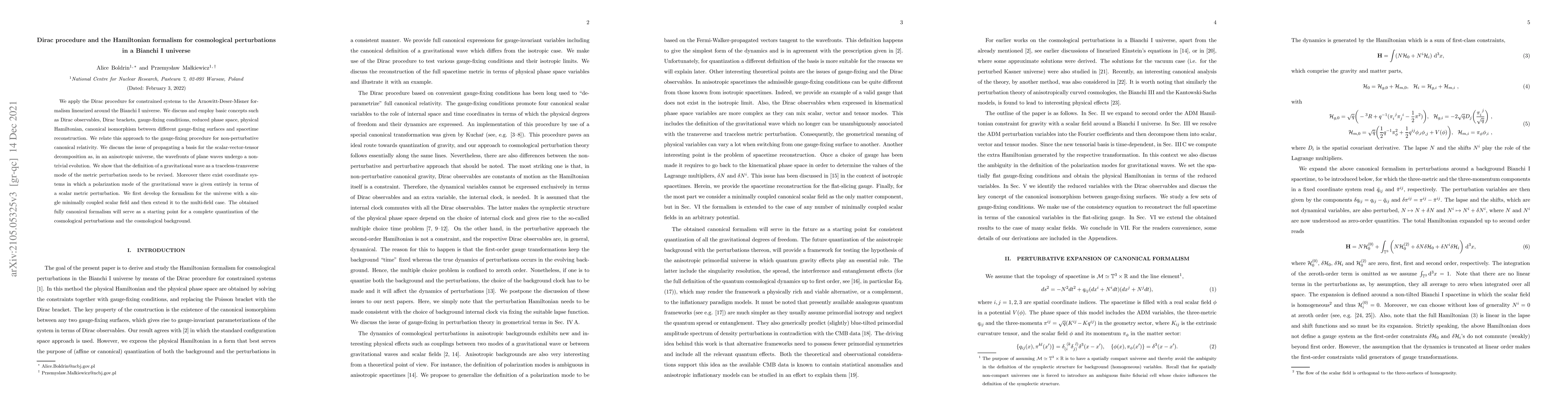 This paper applies the Dirac procedure to the Hamiltonian formalism for cosmological perturbations in a Bianchi I universe, focusing on gauge-fixing, reduced phase space, and the definition of gravitational waves. It extends the framework to multi-field scenarios for future quantization studies.