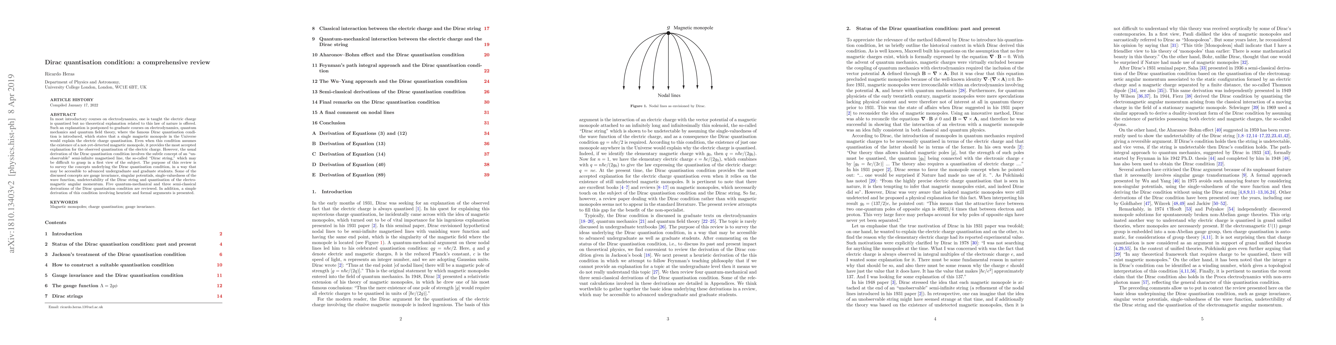 This paper reviews the Dirac quantisation condition, which explains electric charge quantisation through the hypothetical existence of a magnetic monopole, while discussing related concepts like gauge invariance and the Dirac string. It presents multiple derivations accessible to advanced undergraduates and graduate students.