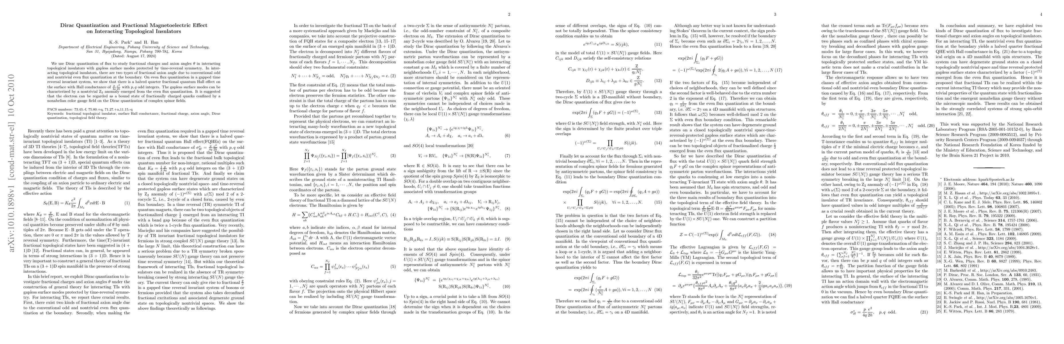 We use Dirac quantization of flux to study fractional charges and axion angles \theta in interacting topological insulators with gapless surface modes protected by time-reversal symmetry. In interacting topological insulators, there are two types of fractional axion angle due to conventional odd and nontrivial even flux quantization at the boundary. On even flux quantization in a gapped time reversal invariant system, we show that there is a halved quarter fractional quantum Hall effect on the surface with Hall conductance of p/4q e2/2h with p and q odd integers. The gapless surface modes can be characterized by a nontrivial Z2 anomaly emerged from the even flux quantization. It is suggested that the electron can be regarded as a bound state of fractionally charged quarks confined by a nonabelian color gauge field on the Dirac quantization of complex spinor fields.