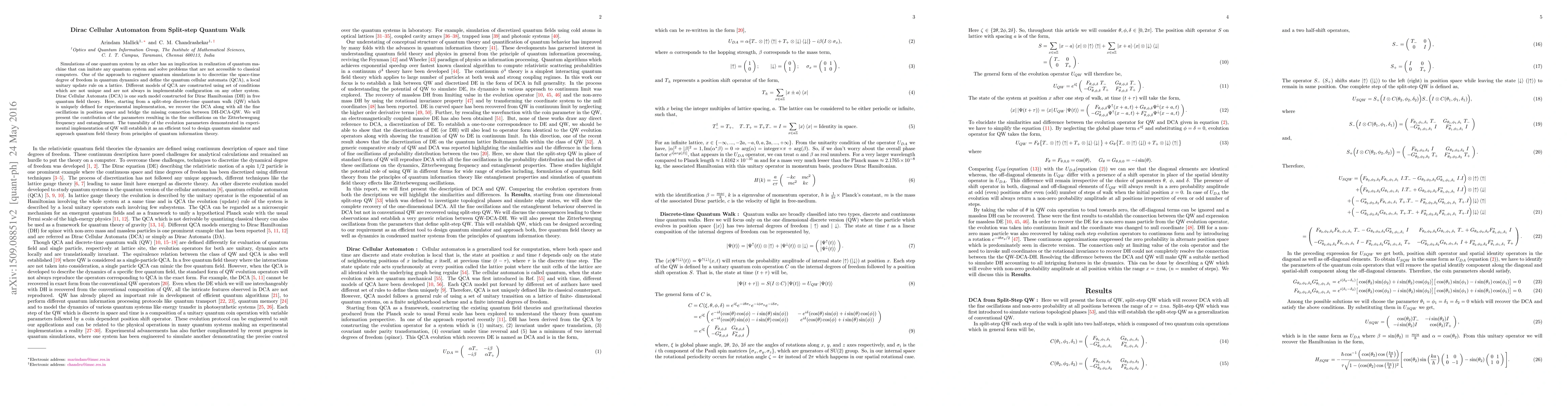 Simulations of one quantum system by an other has an implication in realization of quantum machine that can imitate any quantum system and solve problems that are not accessible to classical computers. One of the approach to engineer quantum simulations is to discretize the space-time degree of freedom in quantum dynamics and define the quantum cellular automata (QCA), a local unitary update rule on a lattice. Different models of QCA are constructed using set of conditions which are not unique and are not always in implementable configuration on any other system. Dirac Cellular Automata (DCA) is one such model constructed for Dirac Hamiltonian (DH) in free quantum field theory. Here, starting from a split-step discrete-time quantum walk (QW) which is uniquely defined for experimental implementation, we recover the DCA along with all the fine oscillations in position space and bridge the missing connection between DH-DCA-QW. We will present the contribution of the parameters resulting in the fine oscillations on the Zitterbewegung frequency and entanglement. The tuneability of the evolution parameters demonstrated in experimental implementation of QW will establish it as an efficient tool to design quantum simulator and approach quantum field theory from principles of quantum information theory.