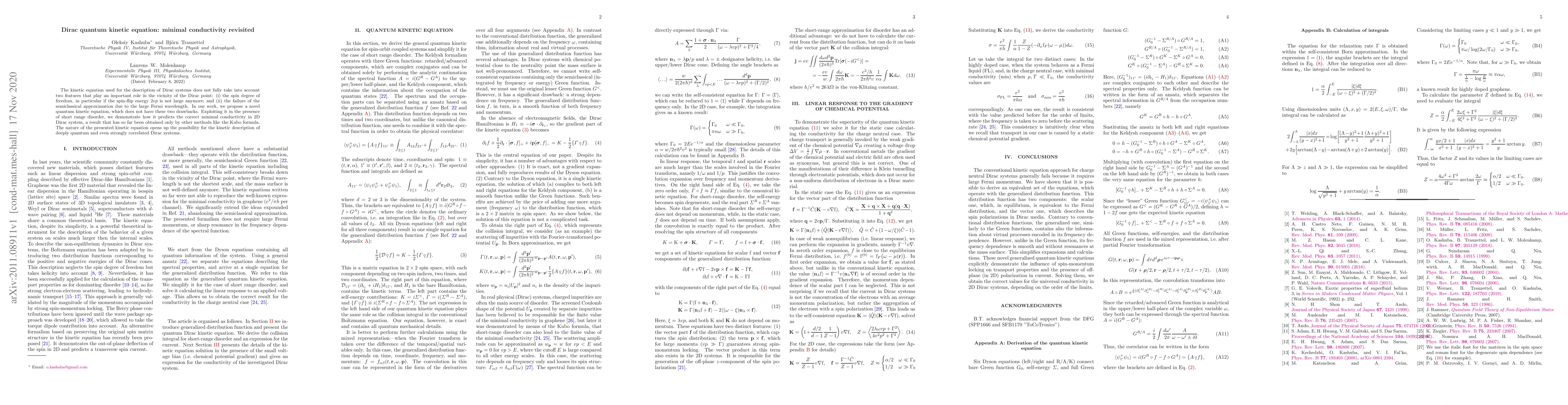 A new quantum kinetic equation is proposed to accurately describe Dirac systems, resolving previous limitations related to spin degree of freedom and the failure of the semiclassical approximation. This equation predicts correct minimal conductivity in 2D Dirac systems.