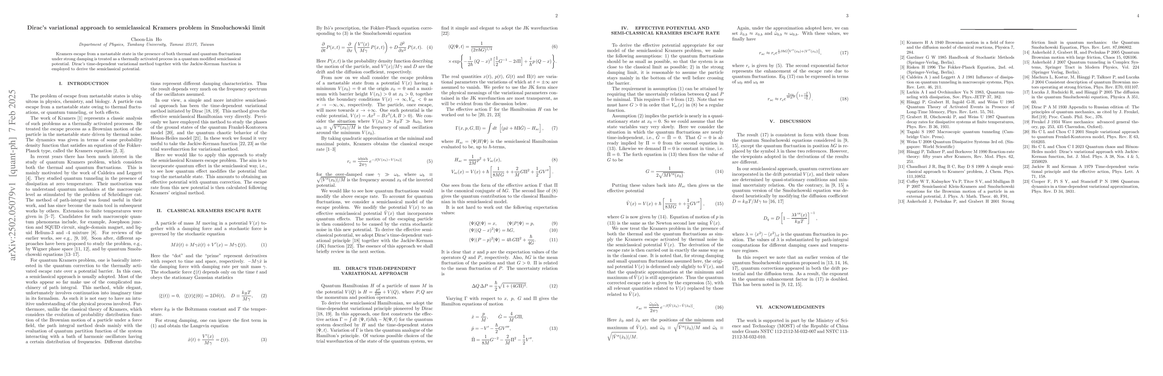 The research employs Dirac's time-dependent variational method along with the Jackiw-Kerman function to derive the semiclassical potential for the Kramers problem in the Smoluchowski limit, treating the escape from a metastable state as a thermally activated process in a quantum-modified semiclassical potential.