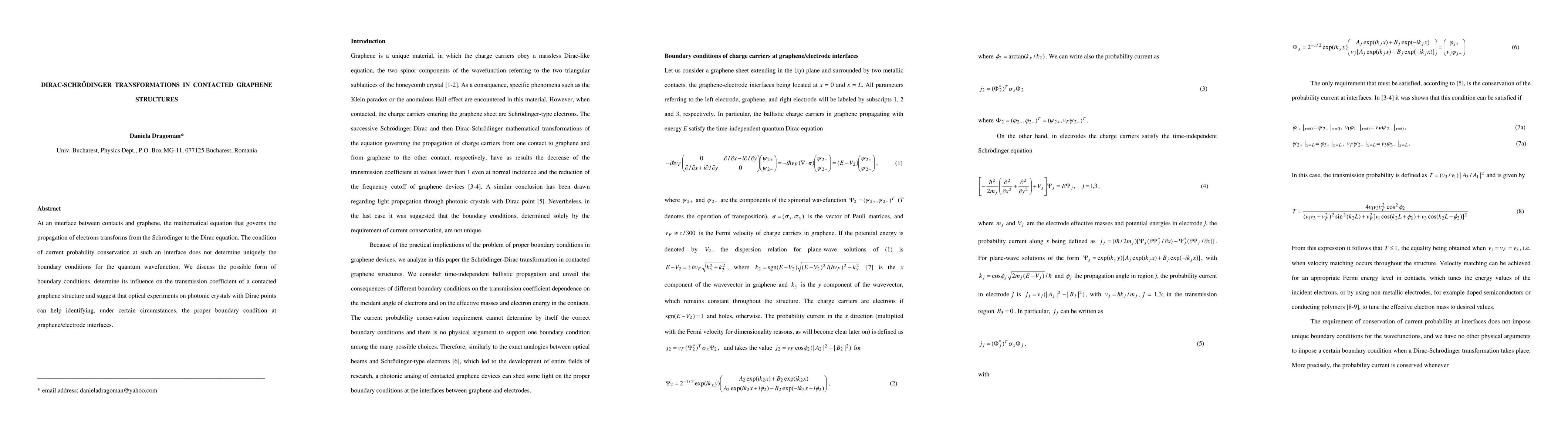 The research investigates the transformation of the governing equation for electron propagation from the Schrodinger to the Dirac equation at the interface between contacts and graphene, exploring boundary conditions and their impact on transmission coefficients.