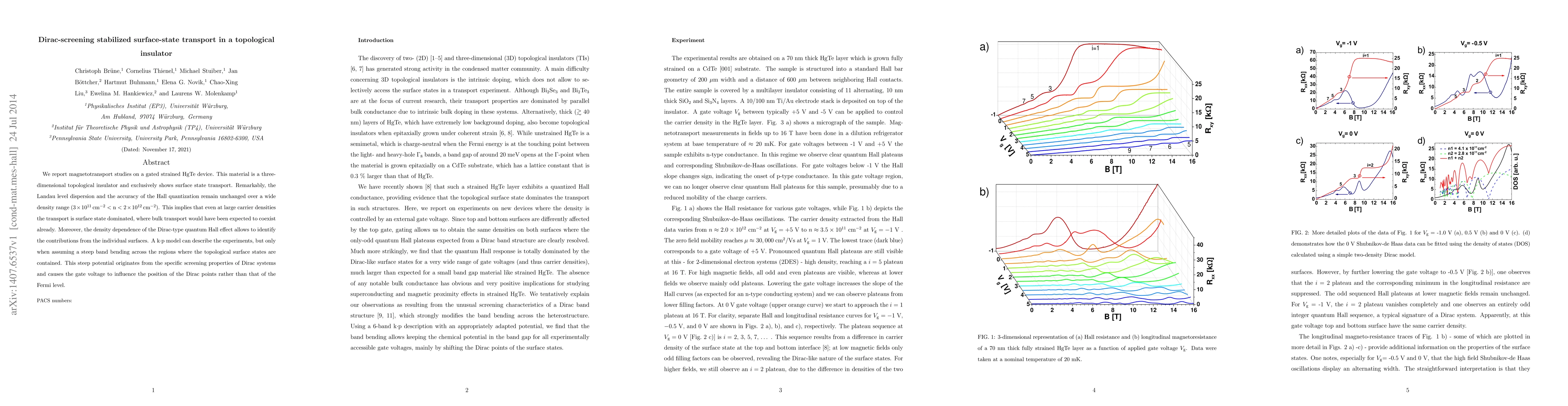 This study investigates magnetotransport in a gated strained HgTe topological insulator, revealing stable surface-state transport over a wide carrier density range. The Dirac-screening effect stabilizes the surface states, allowing accurate Hall quantization despite large carrier densities, indicating dominant surface transport where bulk transport would typically occur.