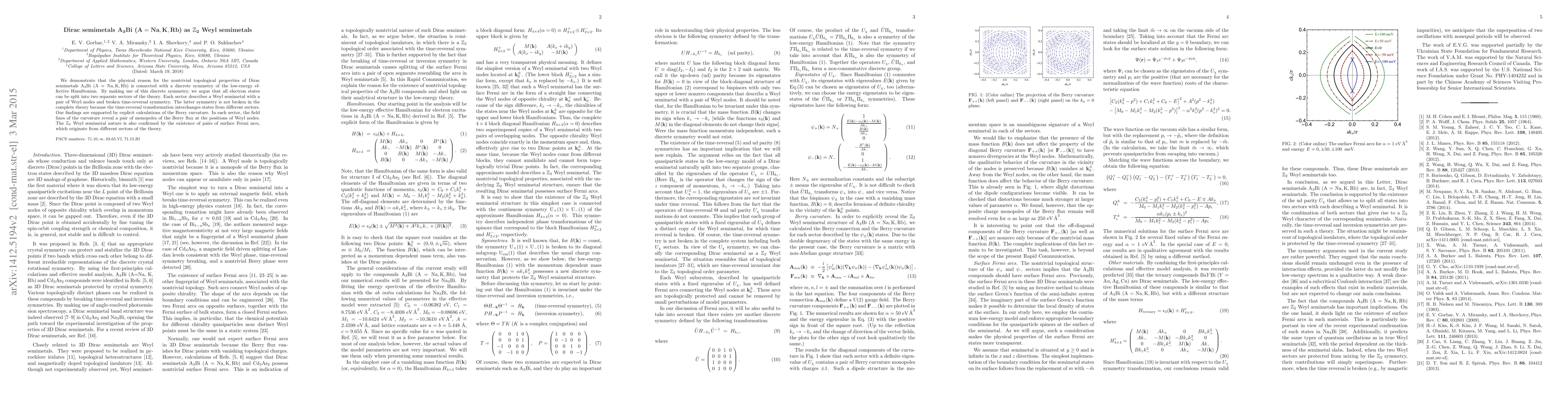 We demonstrate that the physical reason for the nontrivial topological properties of Dirac semimetals $A_3 Bi$ (A=Na,K,Rb) is connected with a discrete symmetry of the low-energy effective Hamiltonian. By making use of this discrete symmetry, we argue that all electron states can be split into two separate sectors of the theory. Each sector describes a Weyl semimetal with a pair of Weyl nodes and broken time-reversal symmetry. The latter symmetry is not broken in the complete theory because the time-reversal transformation interchanges states from different sectors. Our findings are supported by explicit calculations of the Berry curvature. In each sector, the field lines of the curvature reveal a pair of monopoles of the Berry flux at the positions of Weyl nodes. The $Z_2$ Weyl semimetal nature is also confirmed by the existence of pairs of surface Fermi arcs, which originate from different sectors of the theory.