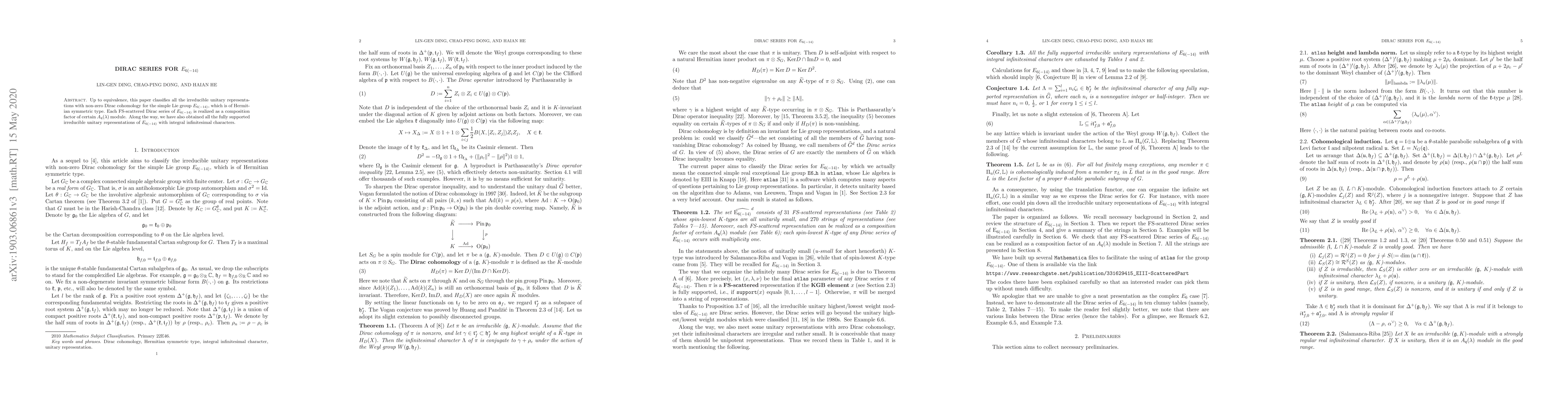 This paper classifies all irreducible unitary representations of $E_{6(-14)}$ with non-zero Dirac cohomology, realizing each FS-scattered Dirac series as a composition factor of specific $A_{\mathfrak{q}}(\lambda)$ modules, and identifies all fully supported irreducible unitary representations with integral infinitesimal characters.