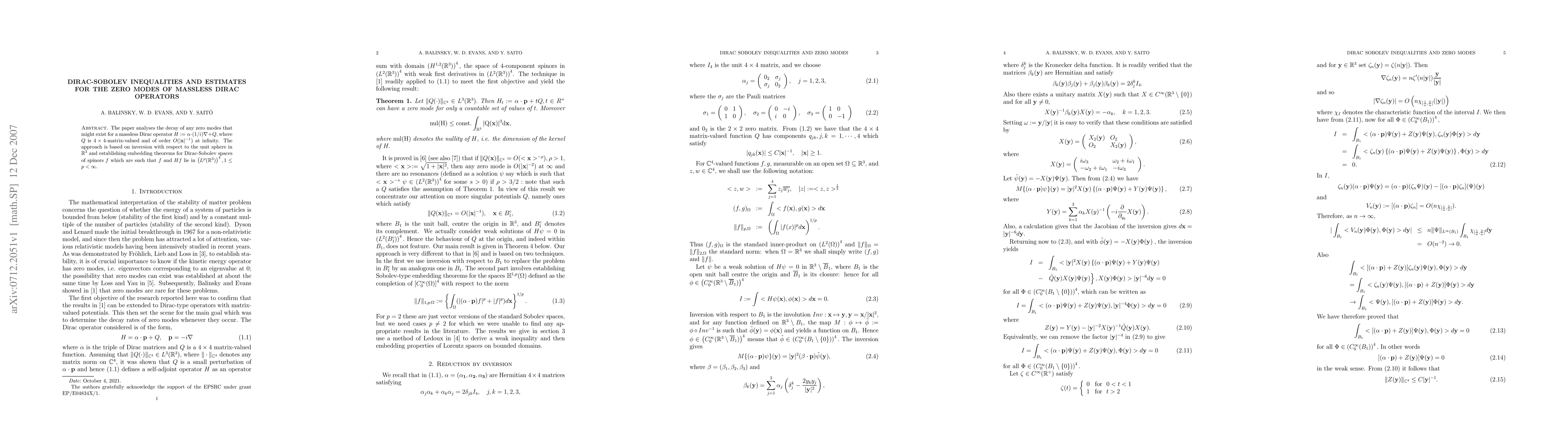 This paper studies how zero modes of massless Dirac operators decay, using inversion techniques and embedding theorems for specific spaces, with implications for understanding their behavior at infinity.