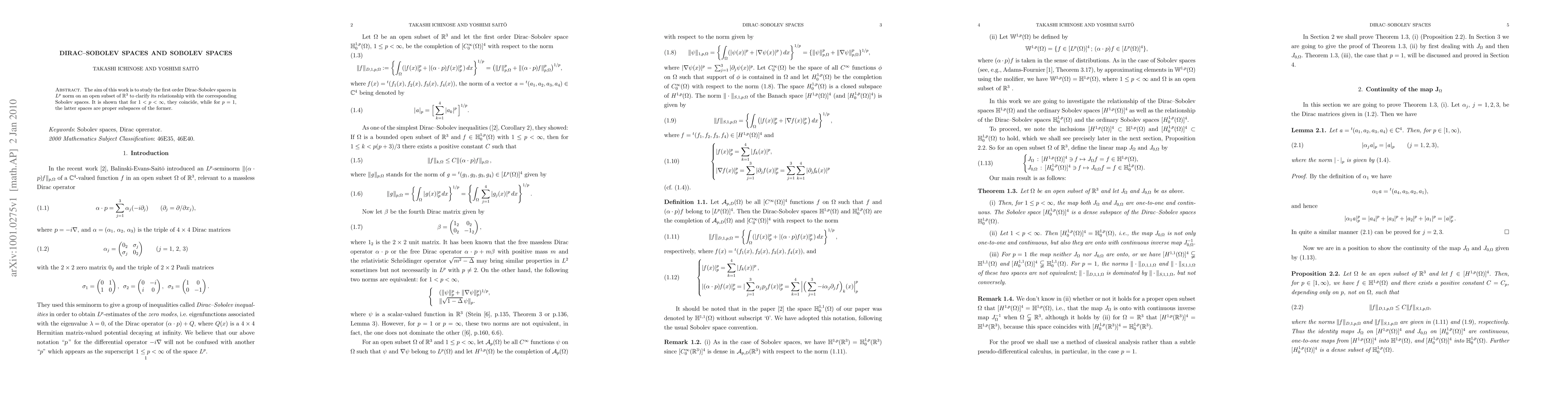 This paper investigates the first-order Dirac-Sobolev spaces in $L^p$ norms within an open subset of ${\mathbb R}^3$, revealing that they coincide with corresponding Sobolev spaces for $1< p <\infty$, but for $p=1$, Sobolev spaces are proper subspaces of the Dirac-Sobolev spaces.