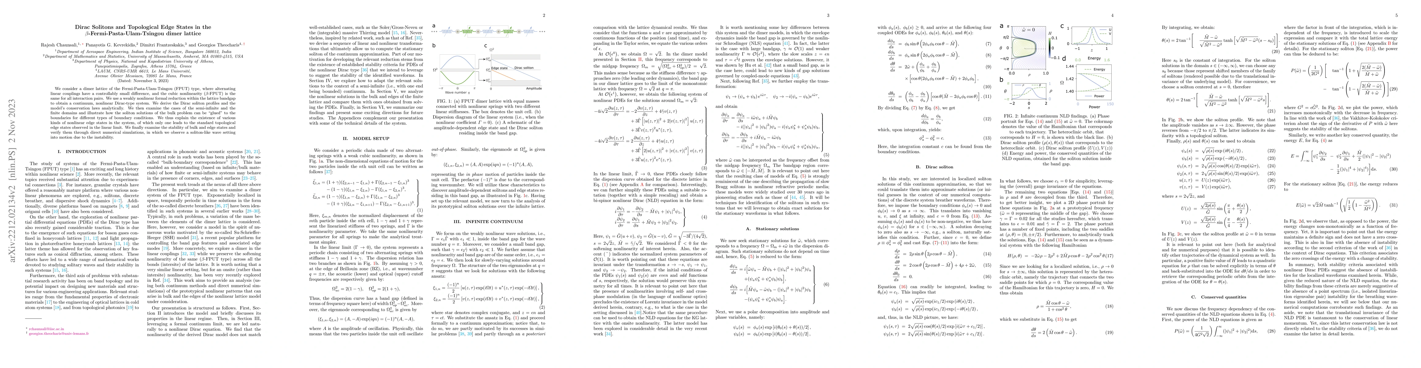 We consider a dimer lattice of the Fermi-Pasta-Ulam-Tsingou (FPUT) type, where alternating linear couplings have a controllably small difference, and the cubic nonlinearity ($\beta$-FPUT) is the same for all interaction pairs. We use a weakly nonlinear formal reduction within the lattice bandgap to obtain a continuum, nonlinear Dirac-type system. We derive the Dirac soliton profiles and the model's conservation laws analytically. We then examine the cases of the semi-infinite and the finite domains and illustrate how the soliton solutions of the bulk problem can be ``glued'' to the boundaries for different types of boundary conditions. We thus explain the existence of various kinds of nonlinear edge states in the system, of which only one leads to the standard topological edge states observed in the linear limit. We finally examine the stability of bulk and edge states and verify them through direct numerical simulations, in which we observe a solitary wave setting into motion due to the instability.