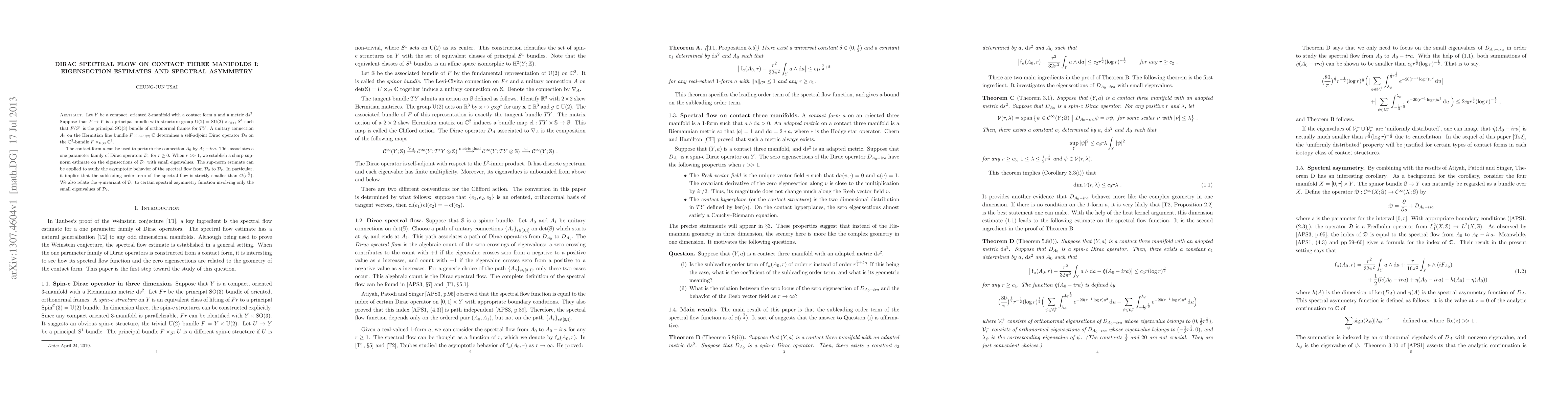 Let $Y$ be a compact, oriented 3-manifold with a contact form $a$ and a metric $ds^2$. Suppose that $F\to Y$ is a principal bundle with structure group $U(2) = SU(2)\times_{\pm1}S^1$ such that $F/S^1$ is the principal SO(3) bundle of orthonormal frames for $TY$. A unitary connection $A_0$ on the Hermitian line bundle $F\times_{\det U(2)}\mathbb{C}$ determines a self-adjoint Dirac operator $D_0$ on the $\mathbb{C}^2$-bundle $F\times_{U(2)}\mathbb{C}^2$. The contact form $a$ can be used to perturb the connection $A_0$ by $A_0-ira$. This associates a one parameter family of Dirac operators $D_r$ for $r\geq0$. When $r>>1$, we establish a sharp sup-norm estimate on the eigensections of $D_r$ with small eigenvalues. The sup-norm estimate can be applied to study the asymptotic behavior of the spectral flow from $D_0$ to $D_r$. In particular, it implies that the subleading order term of the spectral flow is strictly smaller than the order of $r^{\frac{3}{2}}$. We also relate the $\eta$-invariant of $D_r$ to certain spectral asymmetry function involving only the small eigenvalues of $D_r$.