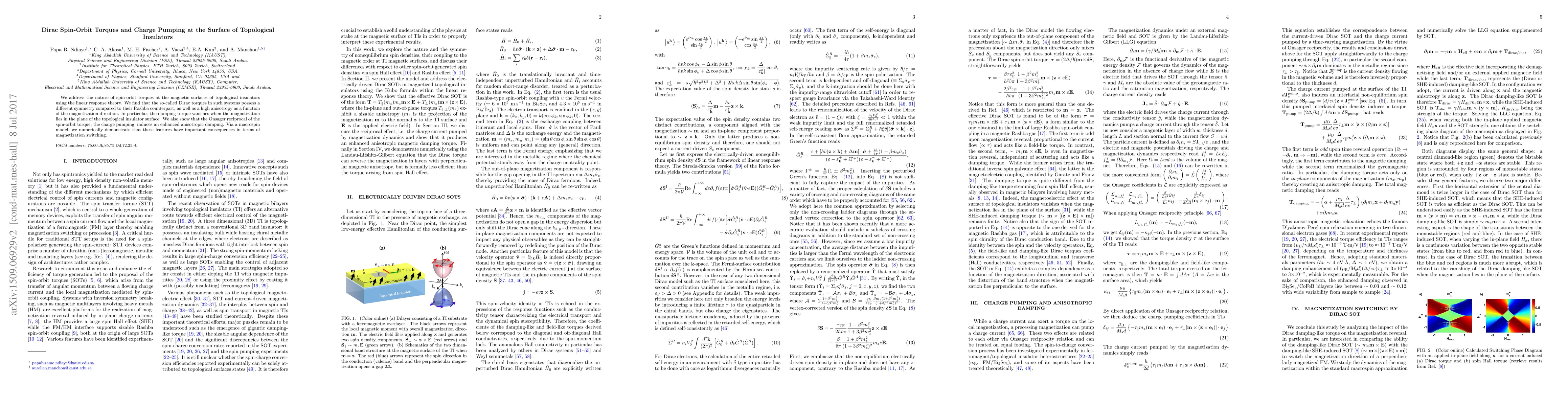 This paper investigates spin-orbit torques at the surface of topological insulators, revealing unique Dirac torques with high anisotropy and distinct symmetry from Rashba torques. Numerical simulations using a macrospin model show that the damping torque vanishes when magnetization is in-plane, impacting magnetization dynamics and switching.