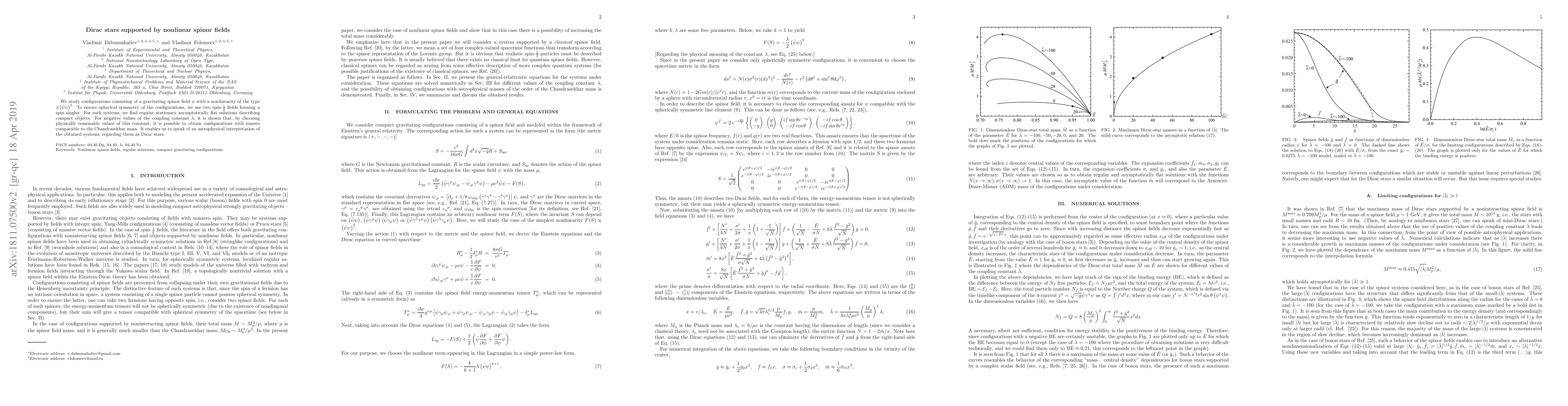 We study configurations consisting of a gravitating spinor field $\psi$ with a nonlinearity of the type $\lambda\left(\bar\psi\psi\right)^2$. To ensure spherical symmetry of the configurations, we use two spin-$\frac{1}{2}$ fields forming a spin singlet. For such systems, we find regular stationary asymptotically flat solutions describing compact objects. For negative values of the coupling constant $\lambda$, it is shown that, by choosing physically reasonable values of this constant, it is possible to obtain configurations with masses comparable to the Chandrasekhar mass. It enables us to speak of an astrophysical interpretation of the obtained systems, regarding them as Dirac stars.
