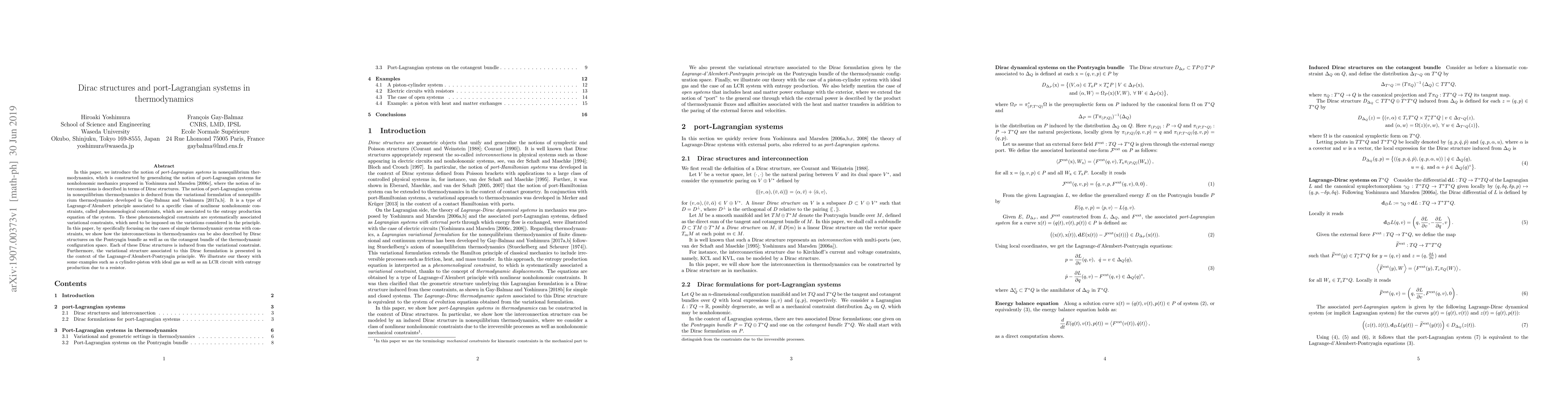 This paper introduces port-Lagrangian systems in nonequilibrium thermodynamics, generalizing concepts from nonholonomic mechanics, and describes interconnections using Dirac structures. It applies the Lagrange-d'Alembert principle to thermodynamic systems with constraints, illustrating the theory with examples like a cylinder-piston and an LCR circuit.