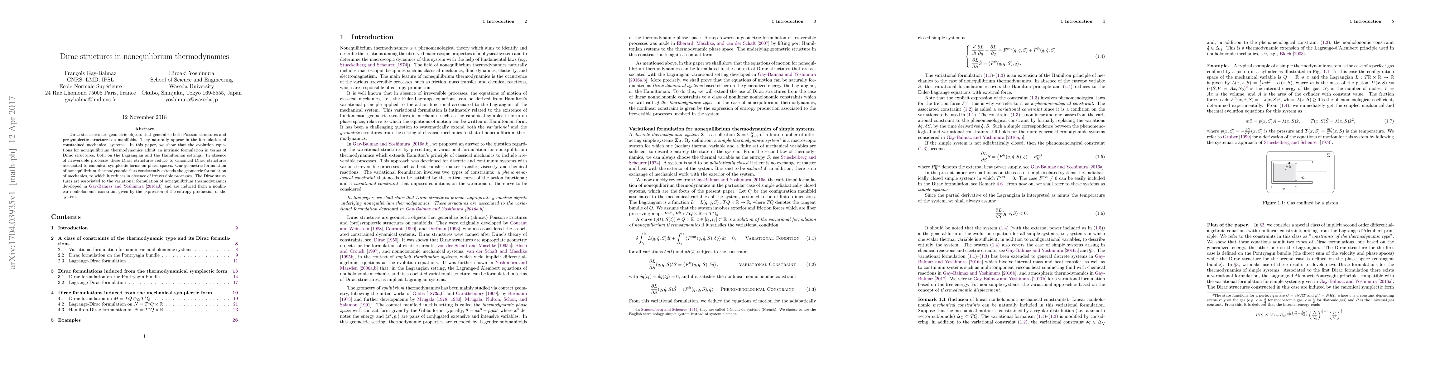 This paper demonstrates that Dirac structures, which generalize Poisson and presymplectic structures, provide a geometric framework for formulating nonequilibrium thermodynamics. The authors show that these structures extend the geometric formulation of mechanics to include irreversible processes, reducing to canonical forms in their absence.