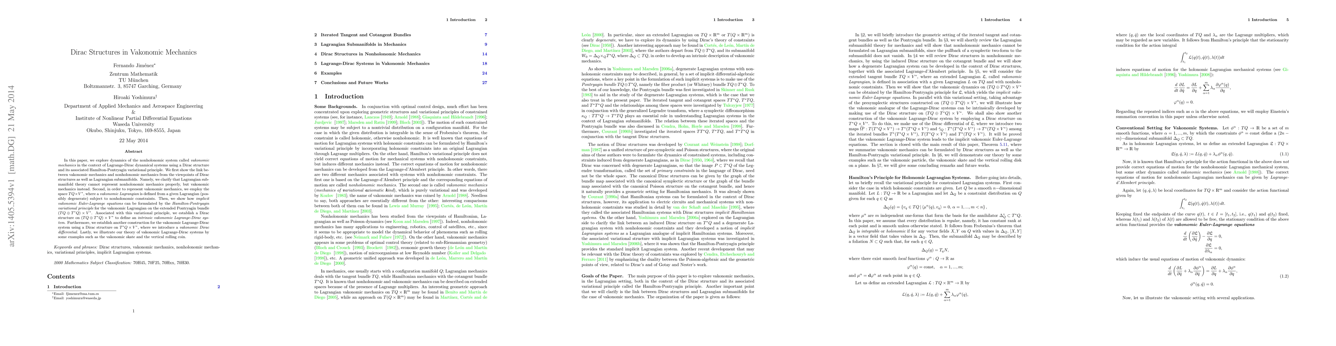 In this paper, we explore dynamics of the nonholonomic system called vakonomic mechanics in the context of Lagrange-Dirac dynamical systems using a Dirac structure and its associated Hamilton-Pontryagin variational principle. We first show the link between vakonomic mechanics and nonholonomic mechanics from the viewpoints of Dirac structures as well as Lagrangian submanifolds. Namely, we clarify that Lagrangian submanifold theory cannot represent nonholonomic mechanics properly, but vakonomic mechanics instead. Second, in order to represent vakonomic mechanics, we employ the space $TQ\times V^{\ast}$, where a vakonomic Lagrangian is defined from a given Lagrangian (possibly degenerate) subject to nonholonomic constraints. Then, we show how implicit vakonomic Euler-Lagrange equations can be formulated by the Hamilton-Pontryagin variational principle for the vakonomic Lagrangian on the extended Pontryagin bundle $(TQ\oplus T^{\ast}Q)\times V^{\ast}$. Associated with this variational principle, we establish a Dirac structure on $(TQ\oplus T^{\ast}Q)\times V^{\ast}$ to define an intrinsic vakonomic Lagrange-Dirac system. Furthermore, we establish another construction for the vakonomic Lagrange-Dirac system using a Dirac structure on $T^{\ast}Q\times V^{\ast}$, where we introduce a vakonomic Dirac differential. Lastly, we illustrate our theory of vakonomic Lagrange-Dirac systems by some examples such as the vakonomic skate and the vertical rolling coin.