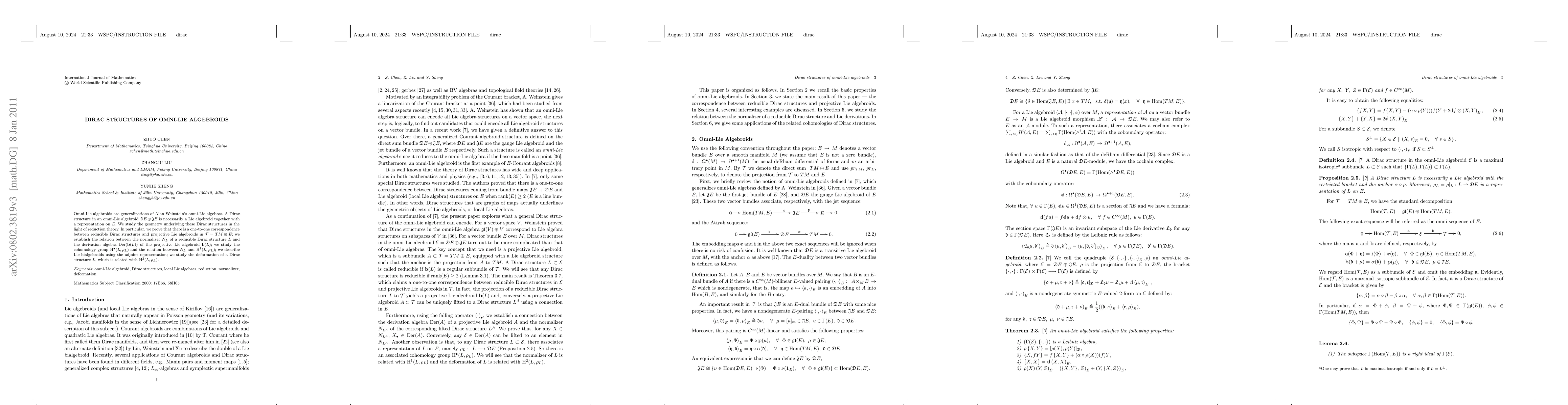 This paper investigates Dirac structures in omni-Lie algebroids, revealing a one-to-one correspondence between reducible Dirac structures and projective Lie algebroids. It also explores the relationship between the normalizer of these structures and their cohomology, and examines the deformation of Dirac structures.