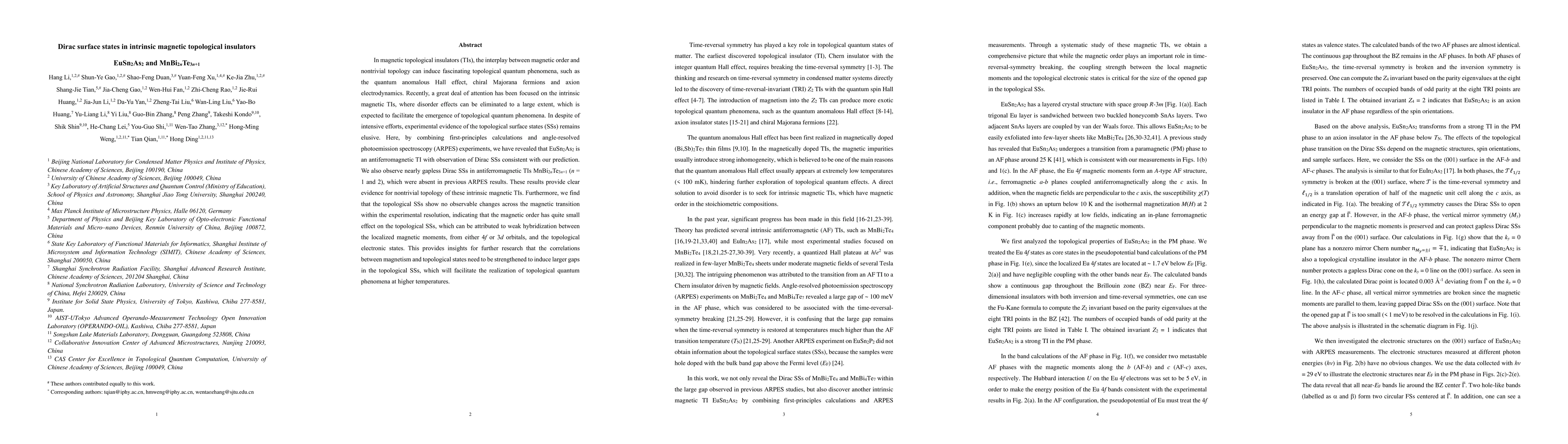 This paper reveals the presence of Dirac surface states in intrinsic magnetic topological insulators EuSn2As2 and MnBi2nTe3n+1 through combined first-principles calculations and ARPES experiments, providing evidence for their nontrivial topological nature. The topological surface states remain stable across magnetic transitions, suggesting minimal impact from magnetic order due to weak hybridization between magnetic and topological states.