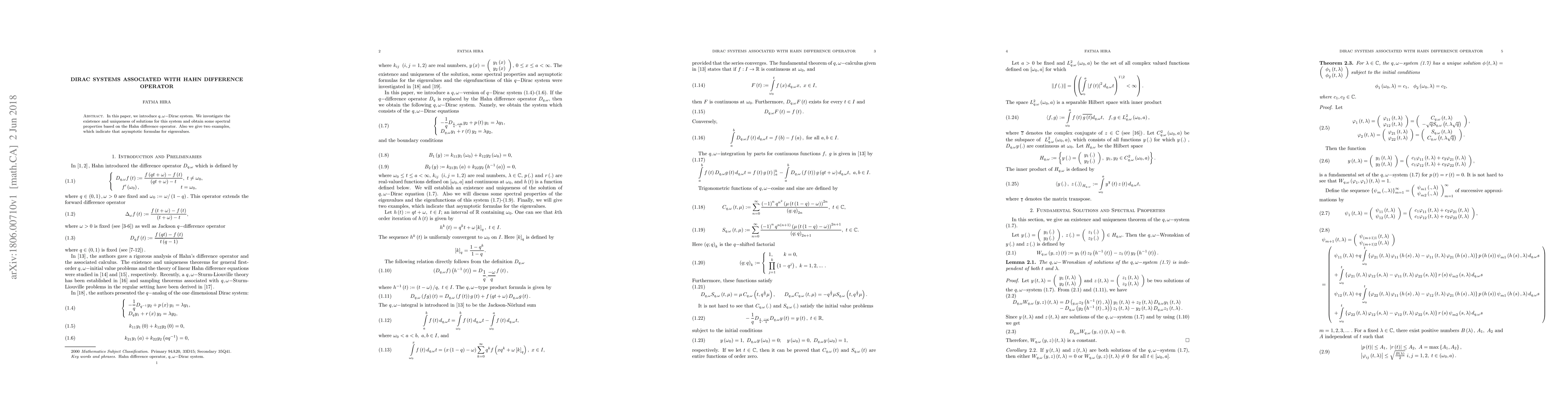 In this paper, we introduce q,{\omega}-Dirac system. We investigate the existence and uniqueness of solutions for this system and obtain some spectral properties based on the Hahn difference operator. Also we give two examples, which indicate that asymptotic formulas for eigenvalues.