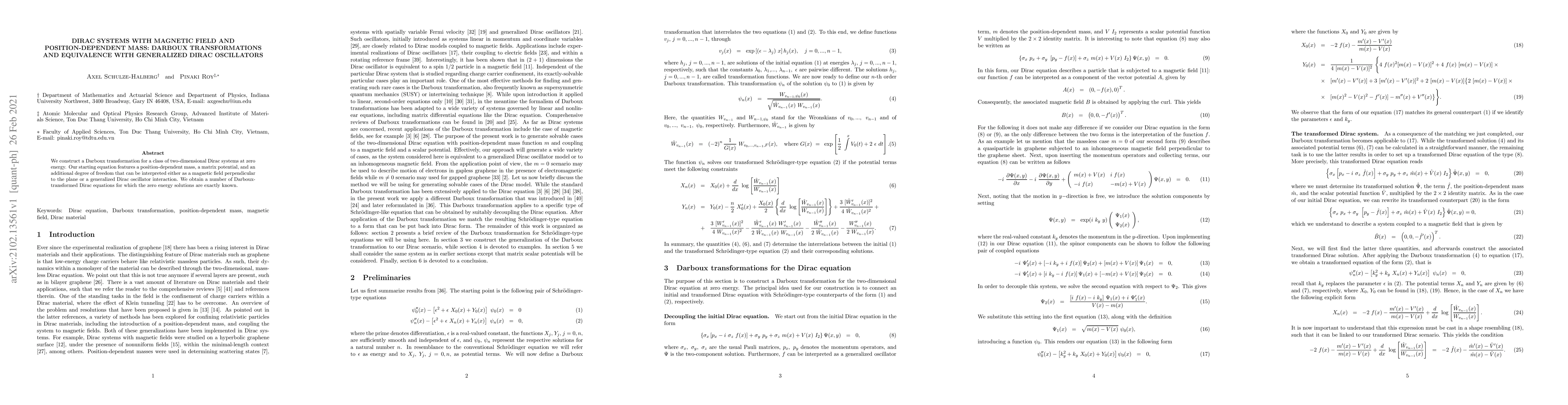 We construct a Darboux transformation for a class of two-dimensional Dirac systems at zero energy. Our starting equation features a position-dependent mass, a matrix potential, and an additional degree of freedom that can be interpreted either as a magnetic field perpendicular to the plane or a generalized Dirac oscillator interaction. We obtain a number of Darbouxtransformed Dirac equations for which the zero energy solutions are exactly known.