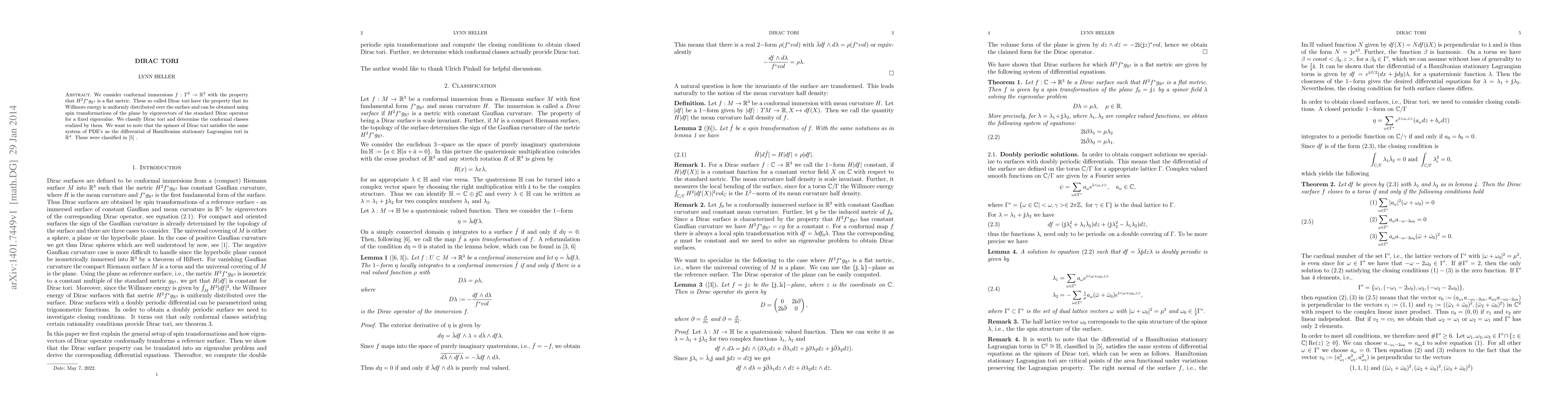 A combination of analytical and numerical methods were used to investigate Dirac tori.