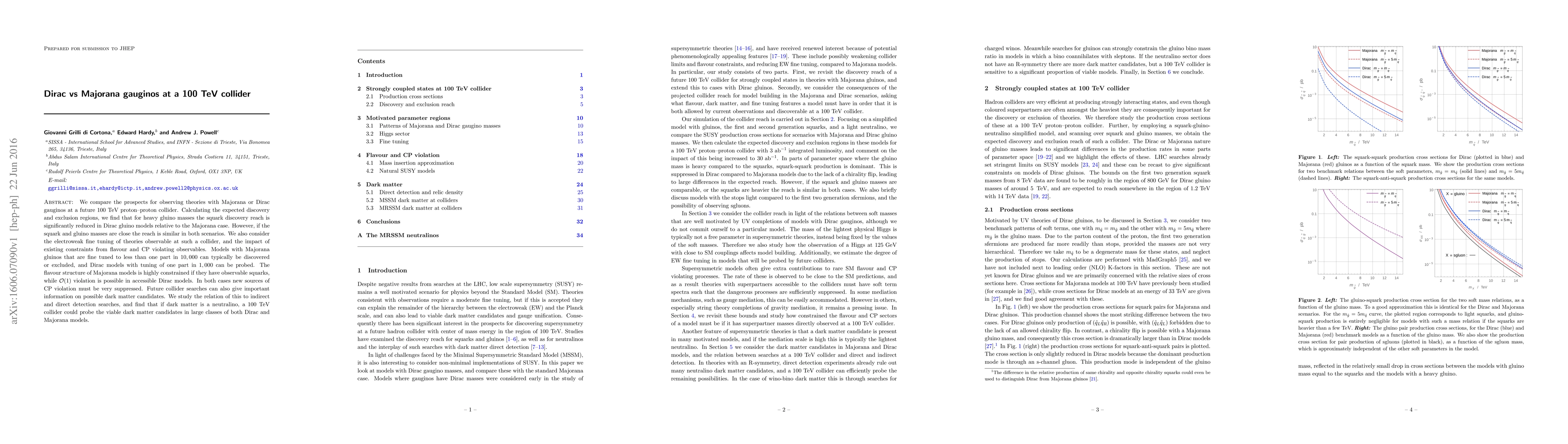 We compare the prospects for observing theories with Majorana or Dirac gauginos at a future 100 TeV proton-proton collider. Calculating the expected discovery and exclusion regions, we find that for heavy gluino masses the squark discovery reach is significantly reduced in Dirac gluino models relative to the Majorana case. However, if the squark and gluino masses are close the reach is similar in both scenarios. We also consider the electroweak fine tuning of theories observable at such a collider, and the impact of existing constraints from flavour and CP violating observables. Models with Majorana gluinos that are fine tuned to less than one part in 10,000 can typically be discovered or excluded, and Dirac models with tuning of one part in 1,000 can be probed. The flavour structure of Majorana models is highly constrained if they have observable squarks, while O(1) violation is possible in accessible Dirac models. In both cases new sources of CP violation must be very suppressed. Future collider searches can also give important information on possible dark matter candidates. We study the relation of this to indirect and direct detection searches, and find that if dark matter is a neutralino, a 100 TeV collider could probe the viable dark matter candidates in large classes of both Dirac and Majorana models.