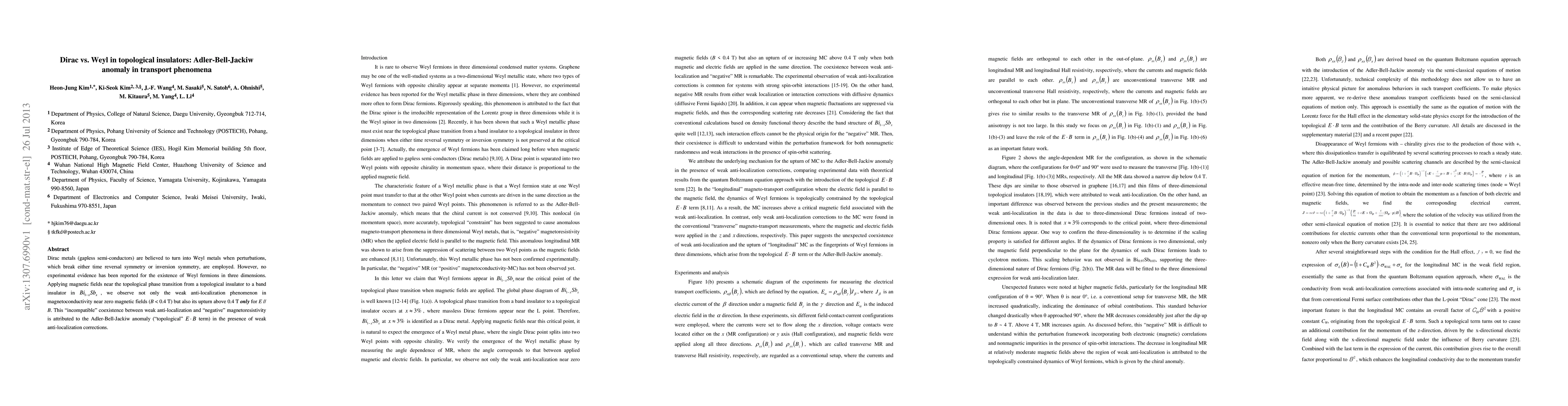 Dirac metals (gapless semi-conductors) are believed to turn into Weyl metals when perturbations, which break either time reversal symmetry or inversion symmetry, are employed. However, no experimental evidence has been reported for the existence of Weyl fermions in three dimensions. Applying magnetic fields near the topological phase transition from a topological insulator to a band insulator in Bi1-xSbx, we observe not only the weak anti-localization phenomenon in magnetoconductivity near zero magnetic fields (B < 0.4 T) but also its upturn above 0.4 T only for E // B. This incompatible coexistence between weak anti-localization and negative magnetoresistivity is attributed to the Adler-Bell-Jackiw anomaly (topological E B term) in the presence of weak anti-localization corrections.