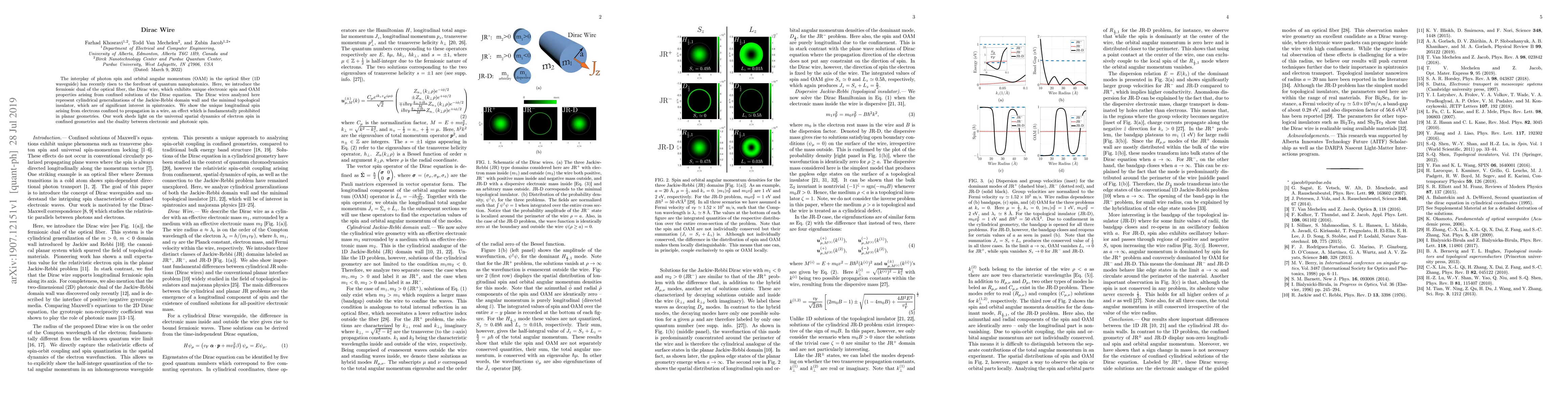 The interplay of photon spin and orbital angular momentum (OAM) in the optical fiber (1D waveguide) has recently risen to the forefront of quantum nanophotonics. Here, we introduce the fermionic dual of the optical fiber, the Dirac wire, which exhibits unique electronic spin and OAM properties arising from confined solutions of the Dirac equation. The Dirac wires analyzed here represent cylindrical generalizations of the Jackiw-Rebbi domain wall and the minimal topological insulator, which are of significant interest in spintronics. We show the unique longitudinal spin arising from electrons confined to propagation in a wire, an effect which is fundamentally prohibited in planar geometries. Our work sheds light on the universal spatial dynamics of electron spin in confined geometries and the duality between electronic and photonic spin.