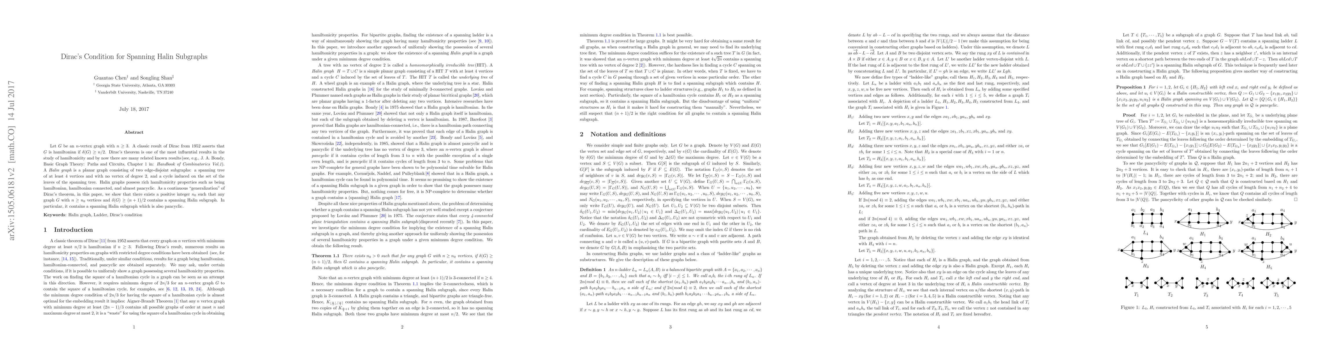 This paper extends Dirac's theorem on hamiltonicity to Halin subgraphs, proving that any graph with sufficient minimum degree contains a spanning Halin subgraph, which is also pancyclic. This generalizes Dirac's condition for hamiltonian graphs to a broader class of graphs.