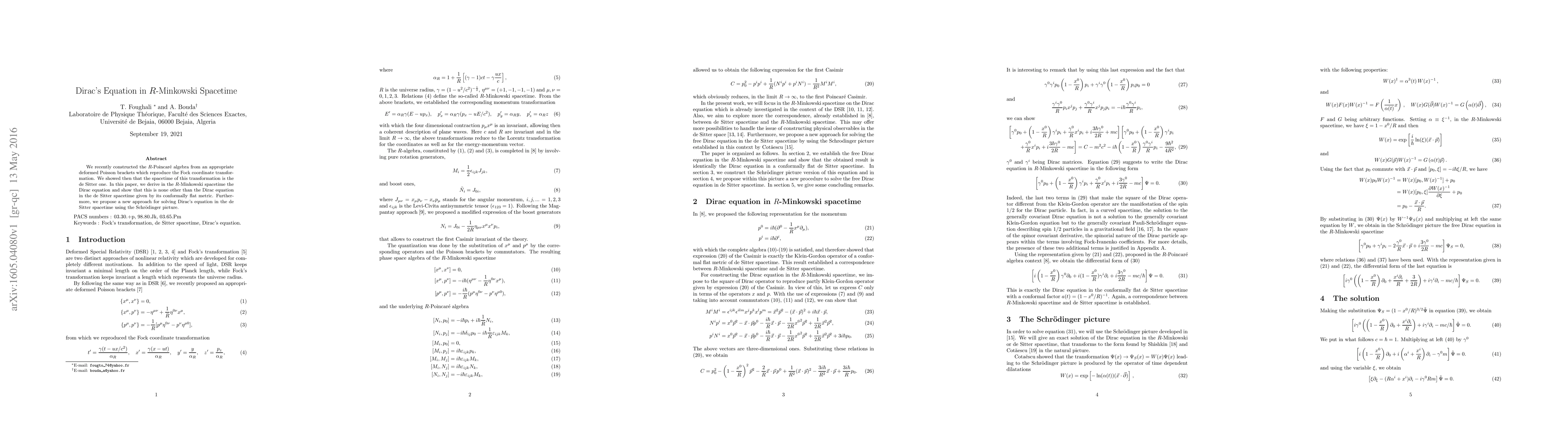 We recently constructed the $R$-Poincar\'e algebra from an appropriate deformed Poisson brackets which reproduce the Fock coordinate transformation. We showed then that the spacetime of this transformation is the de Sitter one. In this paper, we derive in the $R$-Minkowski spacetime the Dirac equation and show that this is none other than the Dirac equation in the de Sitter spacetime given by its conformally flat metric. Furthermore, we propose a new approach for solving Dirac's equation in the de Sitter spacetime using the Schr\"{o}dinger picture.