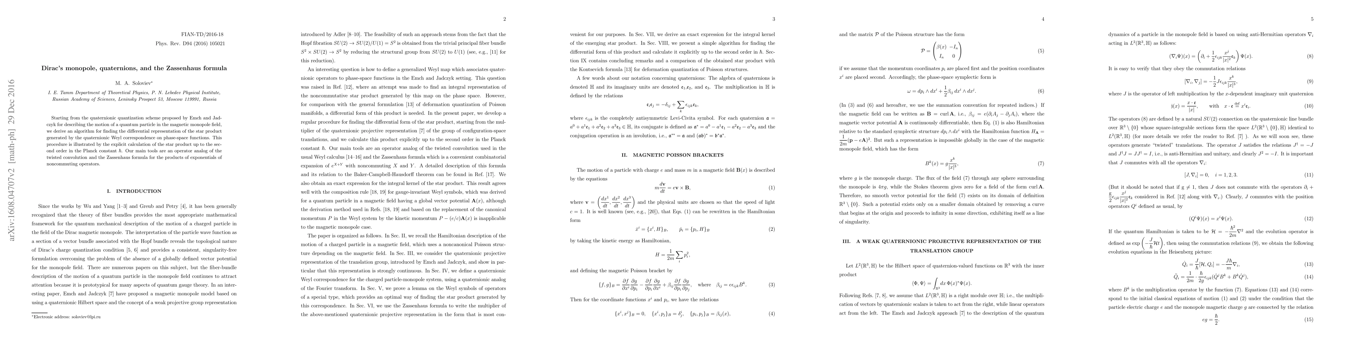 This paper develops an algorithm to derive the differential representation of the star product in the context of Dirac's magnetic monopole using quaternionic quantization. The method employs the twisted convolution and the Zassenhaus formula for noncommuting operator products, demonstrating the star product calculation up to second order in Planck's constant.