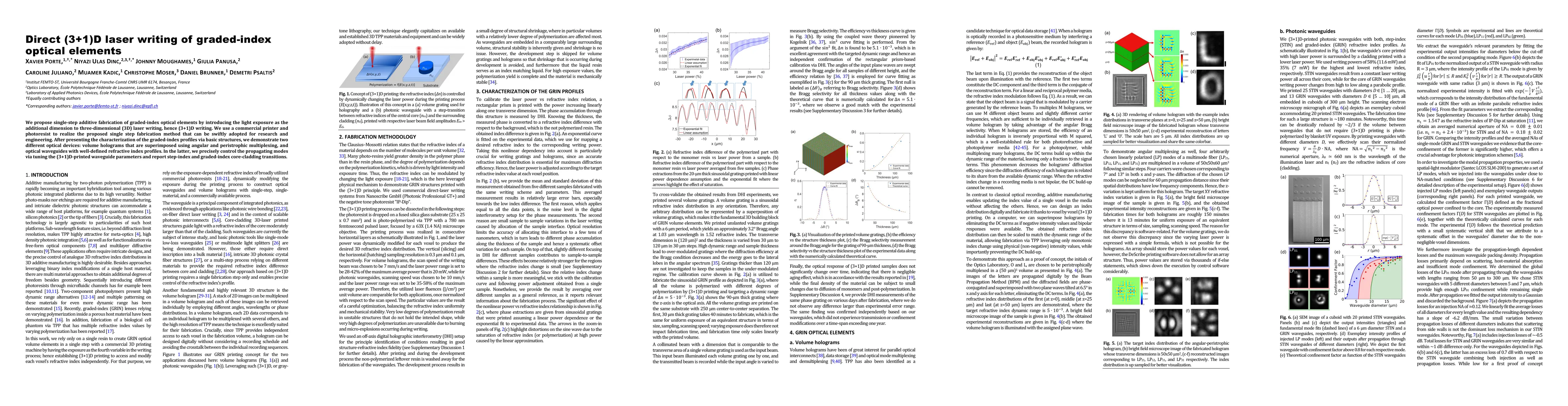 This paper introduces a novel (3+1)D laser writing technique for single-step additive fabrication of graded-index optical elements, demonstrating the creation of volume holograms and optical waveguides with precise refractive index profiles. The method employs a commercial printer and photoresist, showcasing its potential for research and engineering applications.