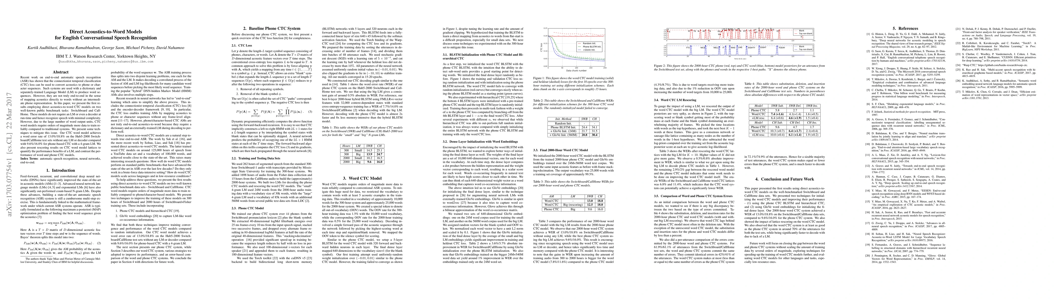 Recent work on end-to-end automatic speech recognition (ASR) has shown that the connectionist temporal classification (CTC) loss can be used to convert acoustics to phone or character sequences. Such systems are used with a dictionary and separately-trained Language Model (LM) to produce word sequences. However, they are not truly end-to-end in the sense of mapping acoustics directly to words without an intermediate phone representation. In this paper, we present the first results employing direct acoustics-to-word CTC models on two well-known public benchmark tasks: Switchboard and CallHome. These models do not require an LM or even a decoder at run-time and hence recognize speech with minimal complexity. However, due to the large number of word output units, CTC word models require orders of magnitude more data to train reliably compared to traditional systems. We present some techniques to mitigate this issue. Our CTC word model achieves a word error rate of 13.0%/18.8% on the Hub5-2000 Switchboard/CallHome test sets without any LM or decoder compared with 9.6%/16.0% for phone-based CTC with a 4-gram LM. We also present rescoring results on CTC word model lattices to quantify the performance benefits of a LM, and contrast the performance of word and phone CTC models.