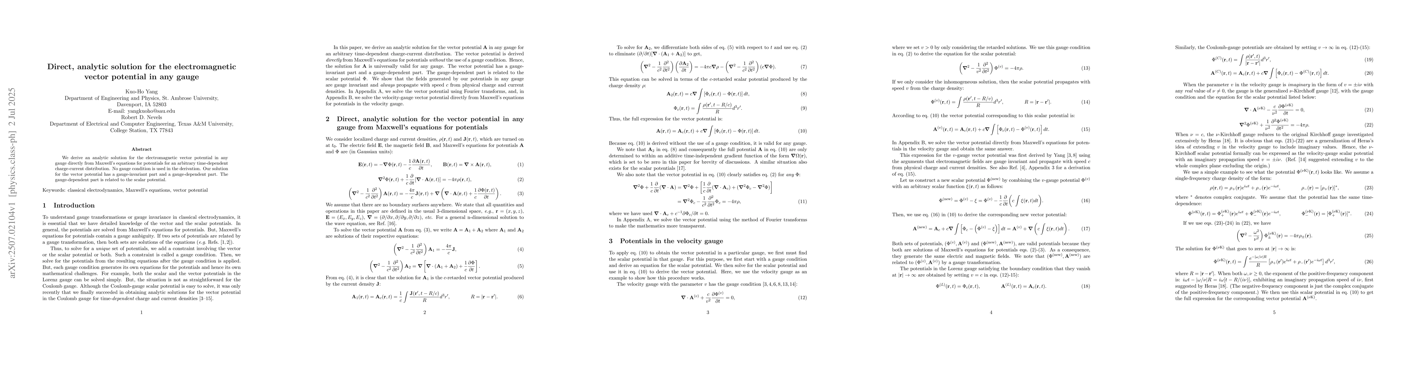We derive an analytic solution for the electromagnetic vector potential in any gauge directly from Maxwell's equations for potentials for an arbitrary time-dependent charge-current distribution. No gauge condition is used in the derivation. Our solution for the vector potential has a gauge-invariant part and a gauge-dependent part. The gauge-dependent part is related to the scalar potential.