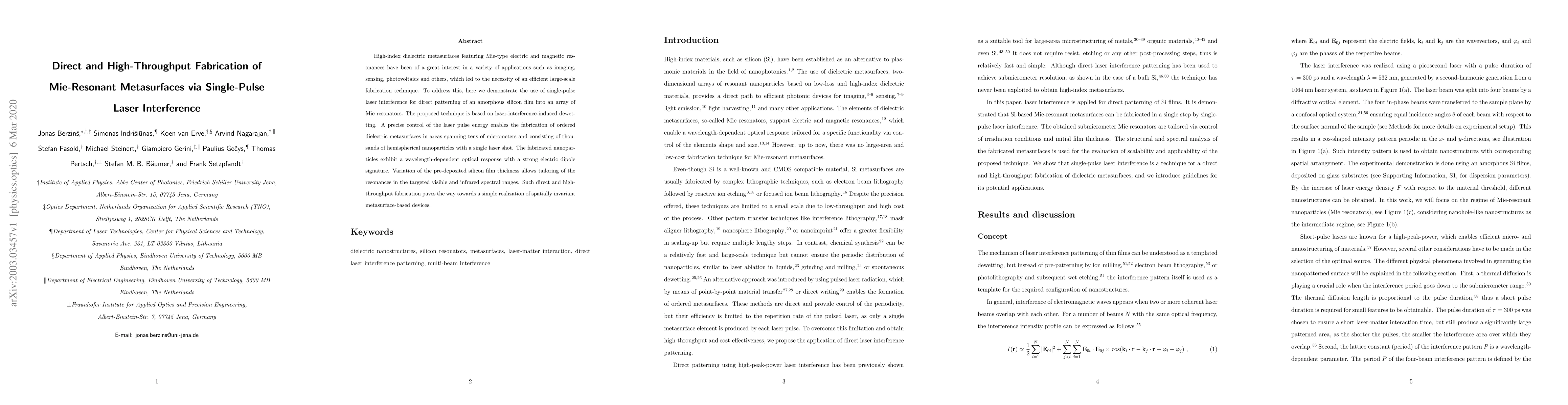 This paper presents a novel method for fabricating high-index dielectric metasurfaces using single-pulse laser interference, enabling the direct patterning of amorphous silicon into Mie resonators. The technique allows for precise control over the laser pulse energy, resulting in ordered arrays of hemispherical nanoparticles with a strong electric dipole response, suitable for applications in imaging and sensing.