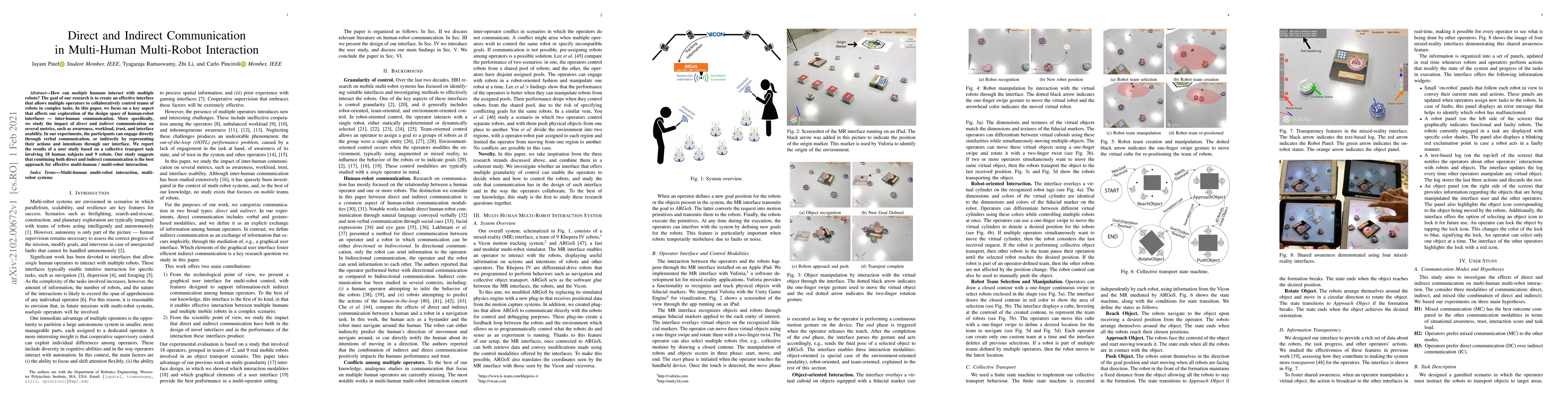This paper investigates how multiple humans can collaboratively control teams of robots using both direct and indirect communication methods. The study finds that combining both forms of communication enhances awareness, workload management, trust, and interface usability in complex multi-human/multi-robot interaction scenarios.